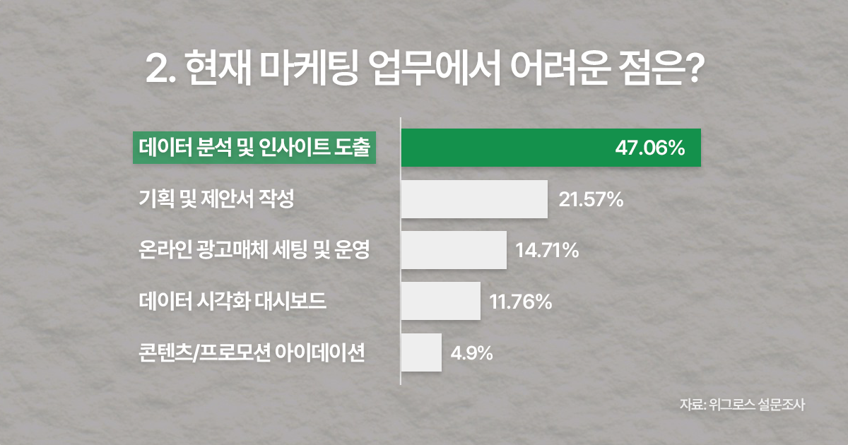 현재 마케팅 업무에서 가장 어려운 점으로는 '데이터 분석 및 인사이트 도출'이 47.06%로 압도적이었어요. '기획 및 제안서 작성'(21.57%), '온라인 광고매체 세팅 및 운영'(14.71%)이 그 뒤를 이었습니다.