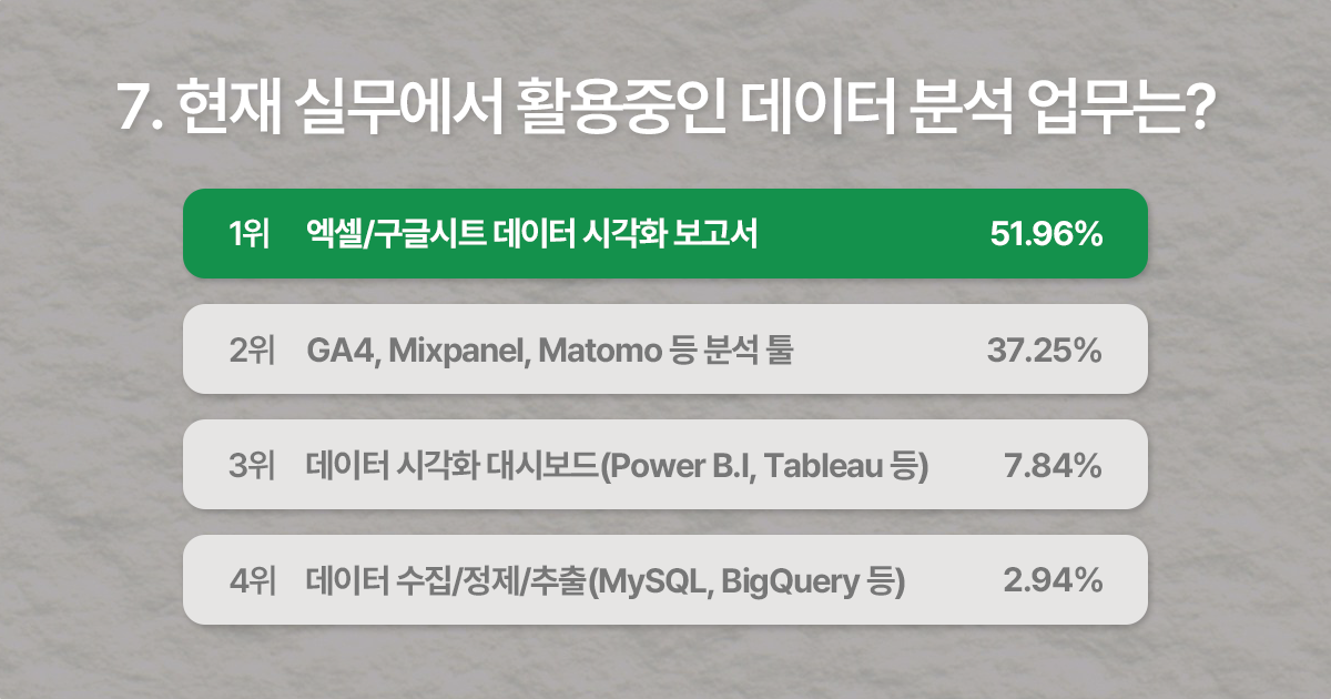 현재 실무에서 가장 많이 활용하는 데이터 분석 업무는 '엑셀/구글시트 데이터 시각화 보고서'가 51.96%로 1위였어요. 'GA4, Mixpanel, Matomo 등 분석 툴'(37.25%)이 그 뒤를 이었고, 'Power BI, Tableau 등 데이터 시각화 대시보드'(7.84%)와 같은 전문 도구의 활용은 아직 낮은 편이네요.