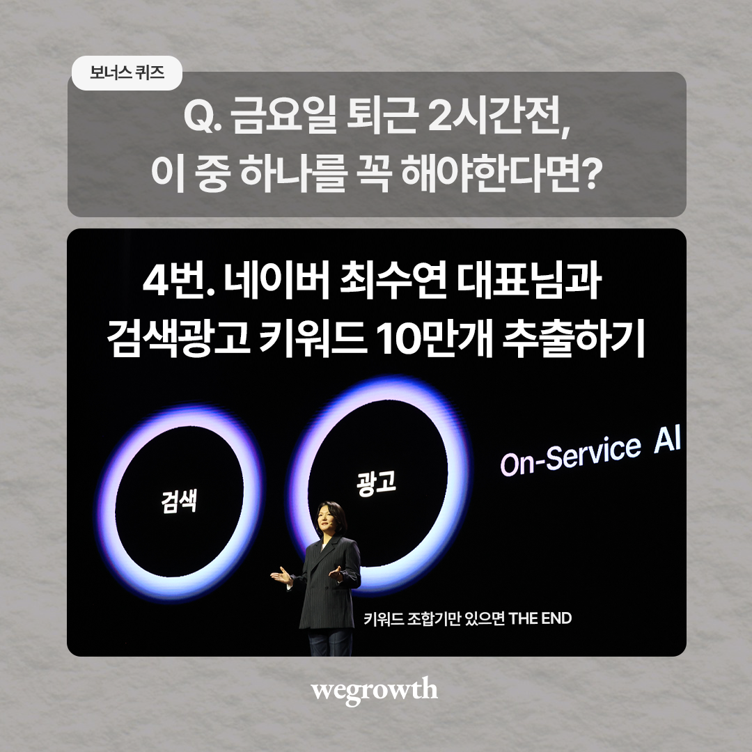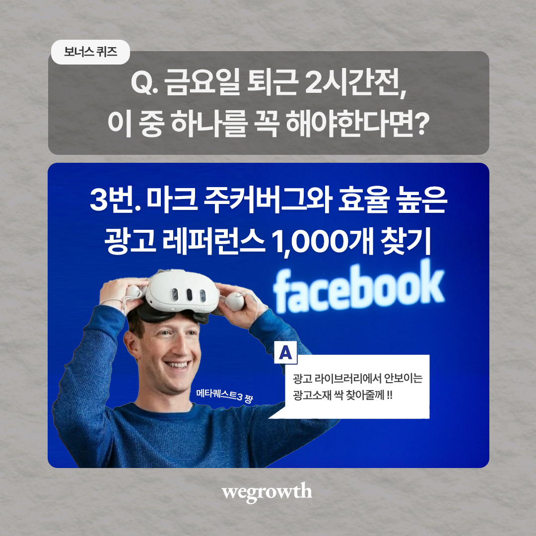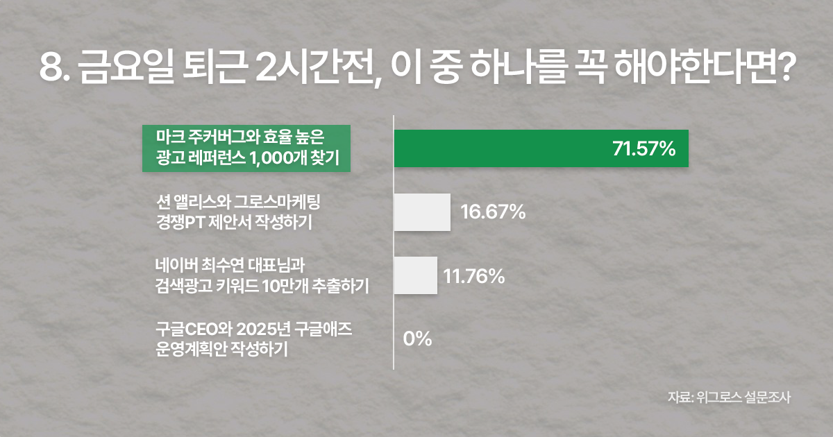 "금요일 퇴근 2시간 전, 이 중 하나를 꼭 해야 한다면?" 이라는 질문에 마케터들의 선택은 정말 현실적이었습니다. '마크 주커버그와 효율 높은 광고 레퍼런스 1,000개 찾기'가 71.57%로 압도적인 1위를 차지했고, '선 엘리스와 그로스마케팅 경쟁PT 제안서 작성하기'(16.67%), '네이버 최수연 대표님과 검색광고 키워드 10만개 추출하기'(11.76%) 순으로 응답했습니다.