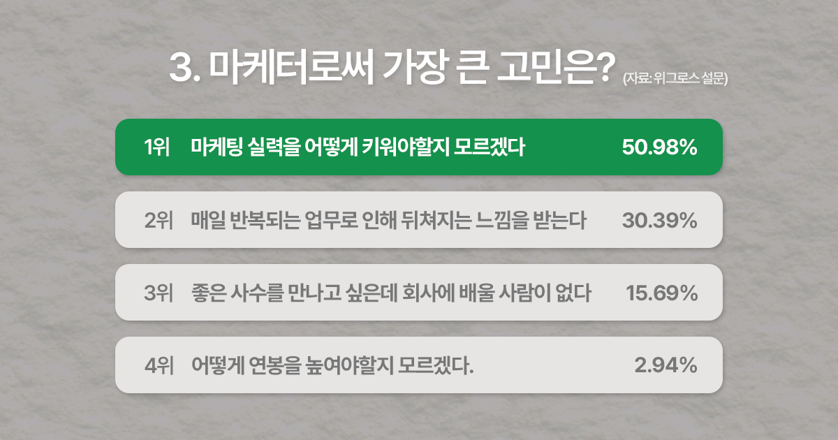 가장 큰 고민으로는 '마케팅 실력을 어떻게 키워야 할지 모르겠다'가 50.98%로 1위를 차지했어요. '매일 반복되는 업무로 인해 뒤처지는 느낌'(30.39%)과 '좋은 사수를 만나고 싶은데 회사에 배울 사람이 없다'(15.69%)는 응답이 그 뒤를 이었습니다. '어떻게 연봉을 높여야할지 모르겠다'(2.94%)는 생각보다 가장 낮은 수치를 기록했는데요.
