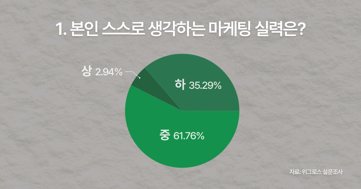 마케터들은 스스로의 실력을 어떻게 평가할까요? 61.76%가 '중' 수준이라고 응답했습니다. '하' 수준이라고 응답한 비율이 35.29%로 그 뒤를 이었고, '상' 수준은 2.94%에 그쳤네요. 대부분의 마케터들이 자신의 실력을 중간 정도로 평가하고 있어요. 최상, 구루(세스고딘 급) 선택지도 있었지만 아무도 선택하지 않았다는 사실!