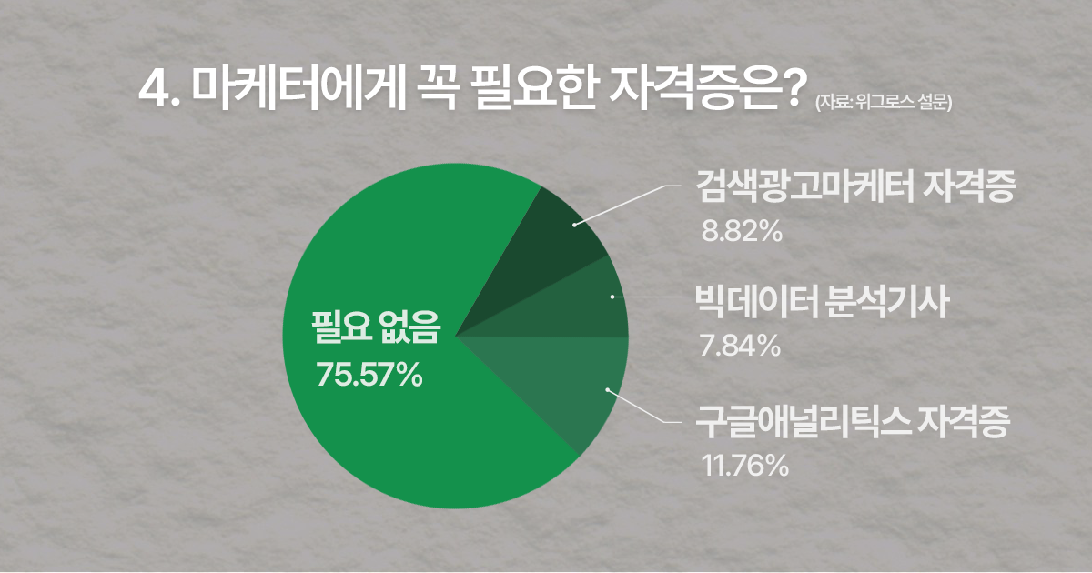 흥미로운 점은 마케터에게 자격증이 '필요 없다'는 응답이 75.57%로 압도적으로 높았습니다. 실무에서 실질적으로 필요한 것은 자격증이 아닌 실무 능력이라고 생각하는 것 같은데요. 다만 구글애널리틱스 자격증(11.76%), 검색광고마케터 자격증(8.82%), 빅데이터분석기사(7.84%) 순으로 일부 필요성을 인정하는 의견도 있었습니다.