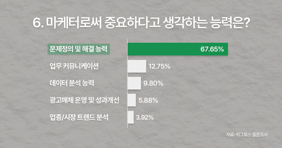 마케터로서 가장 중요하다고 생각하는 능력은 '문제정의 및 해결 능력'이 67.65%로 1위를 차지했습니다. 그리고 '업무 커뮤니케이션'(12.75%), '데이터 분석 능력'(9.80%)이 그 뒤를 이었습니다.