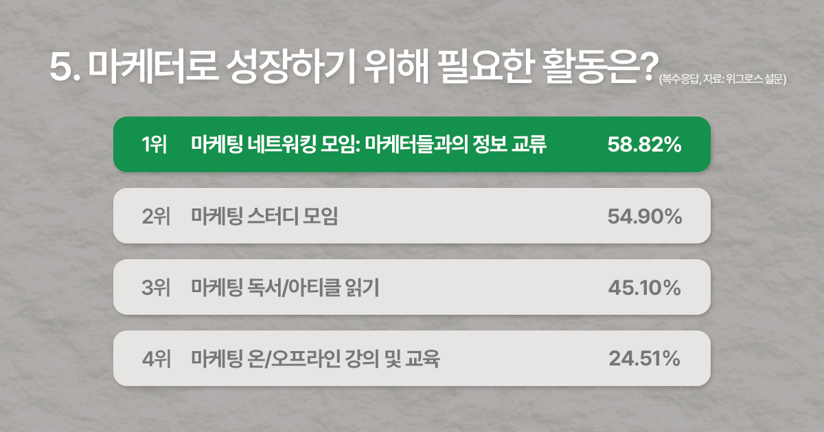 마케터로 성장하기 위해 가장 필요한 활동으로는 '마케팅 네트워킹 모임과 마케터들과의 정보 교류'가 58.82%로 1위를 차지했어요. '마케팅 스터디 모임'(54.90%), '마케팅 독서/아티클 읽기'(45.10%)가 그 뒤를 이었습니다. 특히 실무자들과의 교류와 네트워킹이 중요하다고 생각하는 것으로 나타났네요!