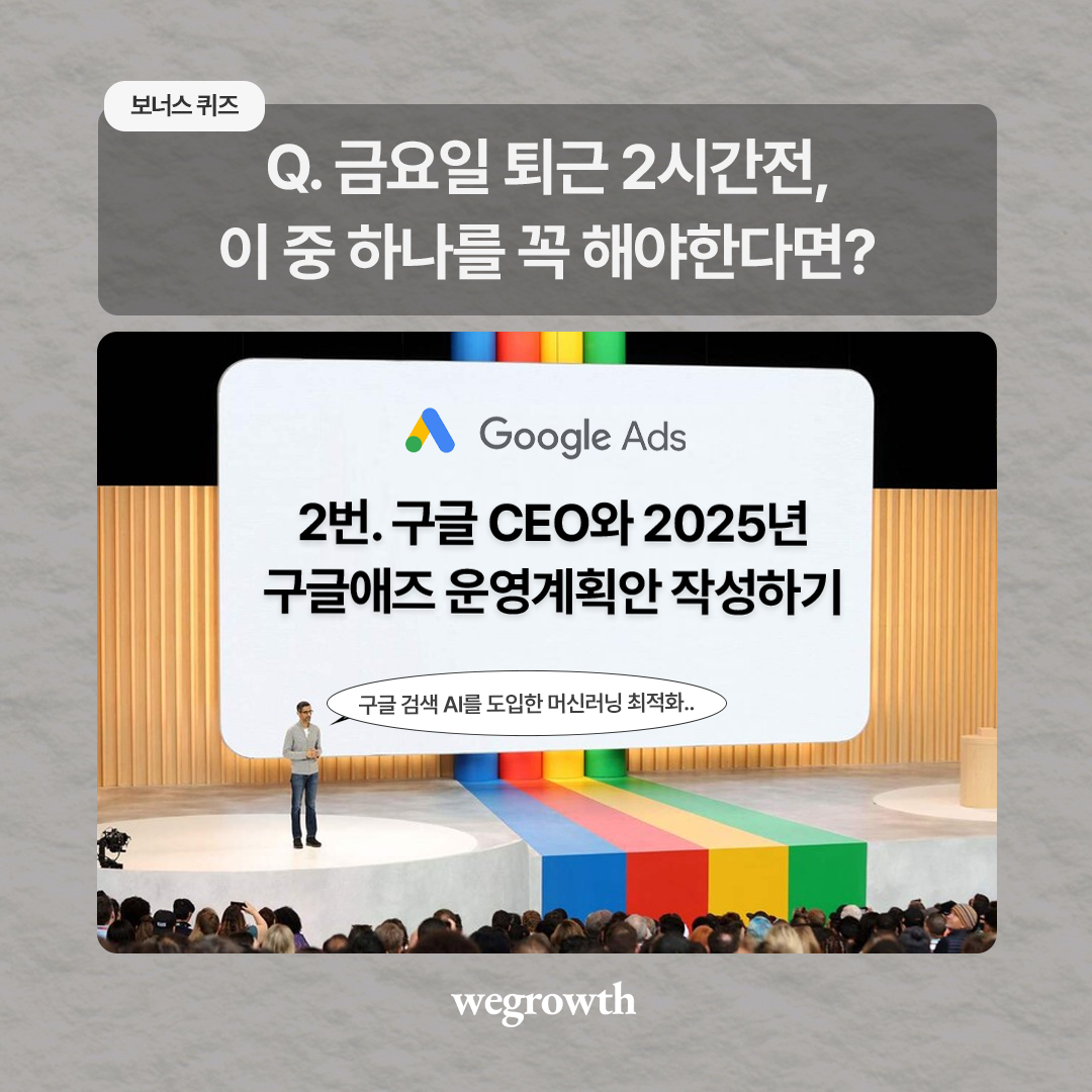 설문에 참여해주신 102명의 마케터들분들께 다시 한번 감사의 말씀드리며, 2025년 올 한해 마케터로써 더욱 성장하는 한 해가 되시길 바랍니다. 반복되는 일상 속에서도 지금의 고민을 해결하기 위해 마케팅 실력을 키우며 나아가다 보면, 어느새 더 성장한 자신을 발견하게 되실거라 생각합니다.