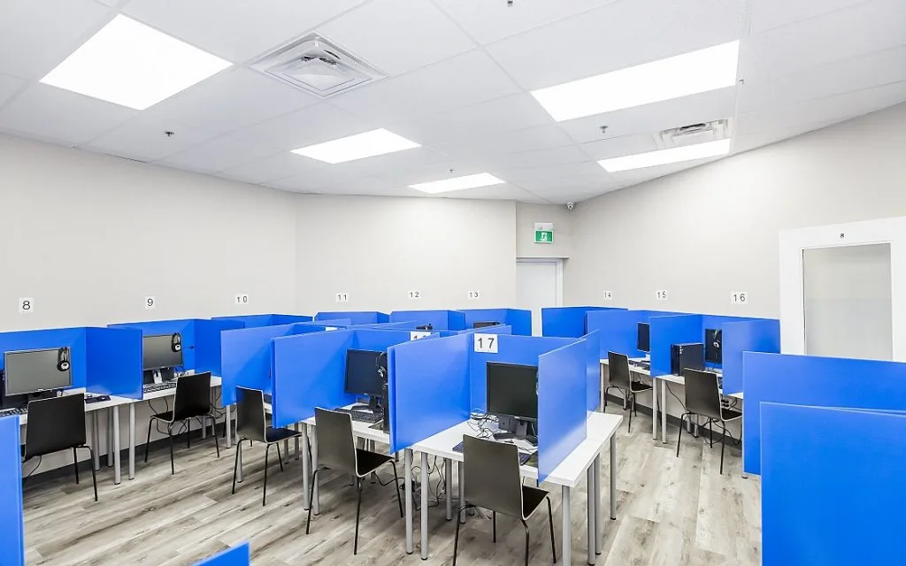시험이 치러질 공간은 칸막이가 쳐진 좁고 밀집된 공간이었다.