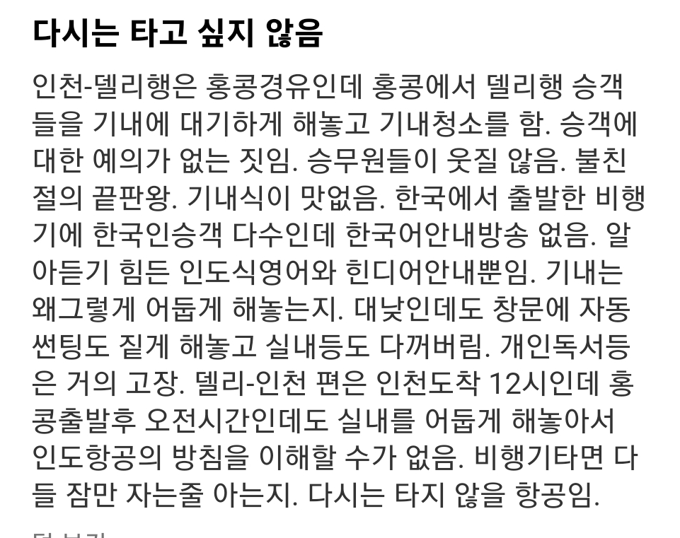 체크인 기다리는 줄 앞에 선 내 앞의 남자가 에어인디아가 자기가 타본 항공사 중에 제일 후진 항공사라고 친구에게 투덜대는데 도대체 얼마나 안 좋기에 저러지 무서워졌다.