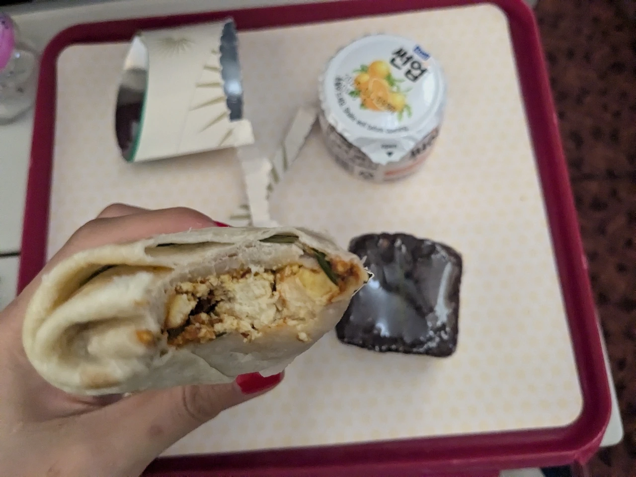 치킨 랩이 다 떨어졌다고 해서 베지터블 랩으로 먹었다