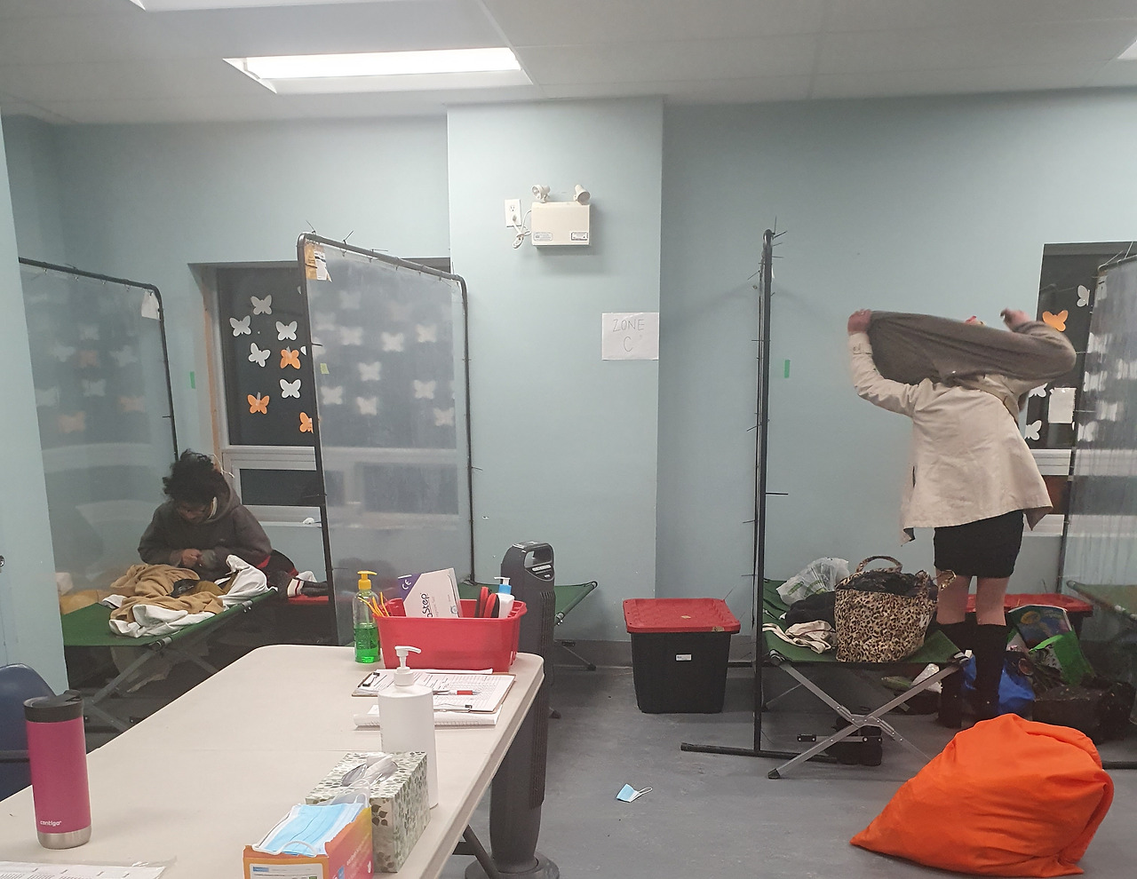 센터의 아침 업무는 이용자들이 퇴실하는 즉시 시작된다. 이용자들이 모두 나가면 약 한 시간 동안 침대를 정리하고, 이동식 테이블과 의자를 세팅해 공간을 정돈한다. 이후 입실 시간이 되면 이용자들의 이름을 체크하며 차례로 들여보낸다.