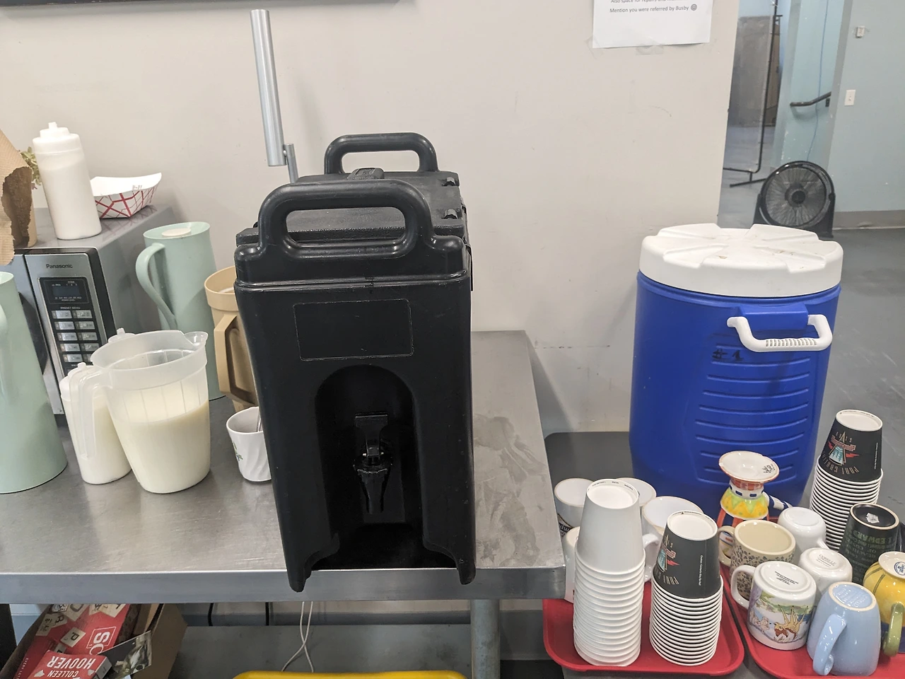 큰 물통에 깨끗한 물을 채워놓는다. 종이컵과 머그잔을 준비해 비치한다.