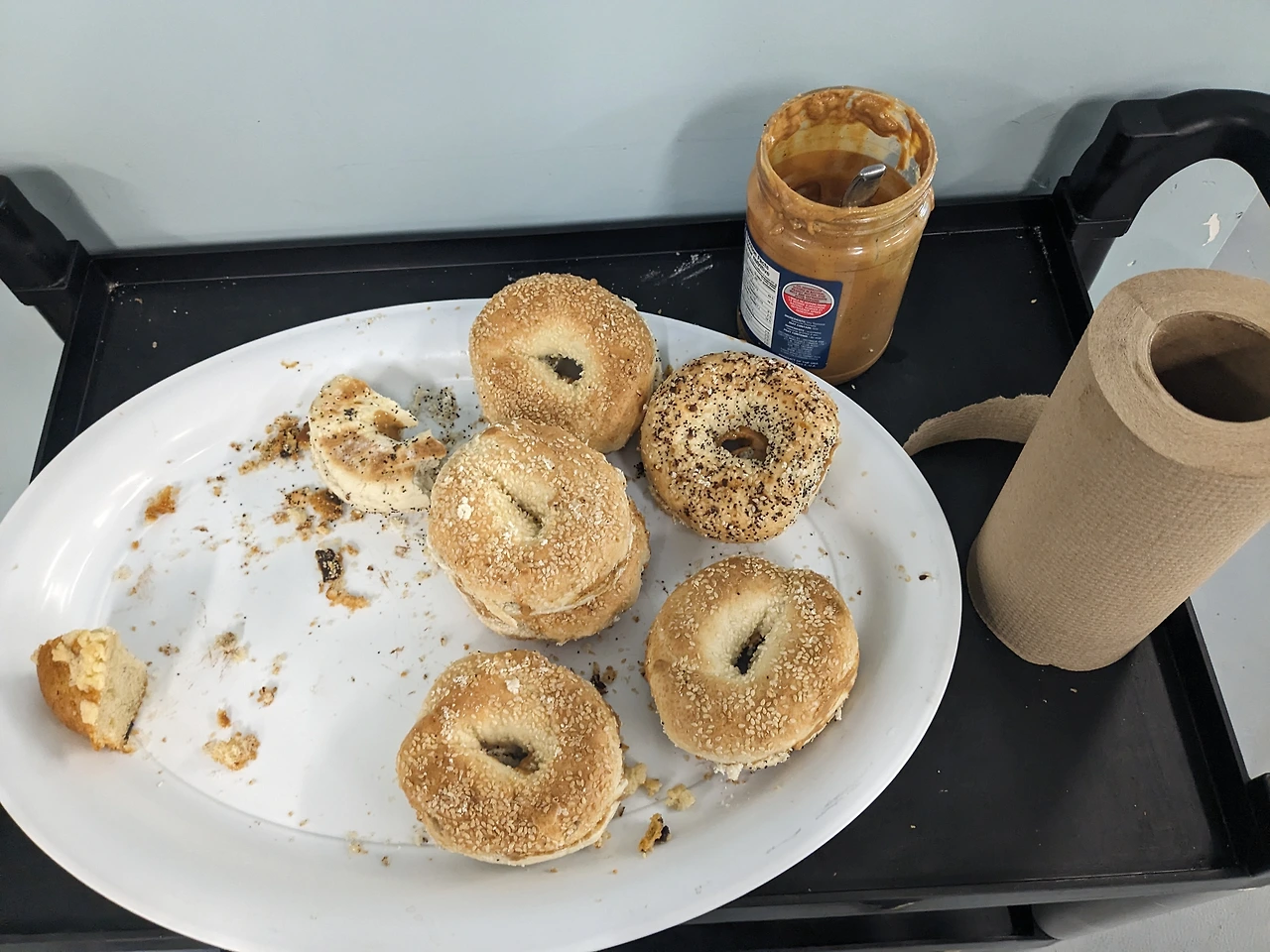 주말 아침 메뉴는 땅콩버터와 베이글이다.