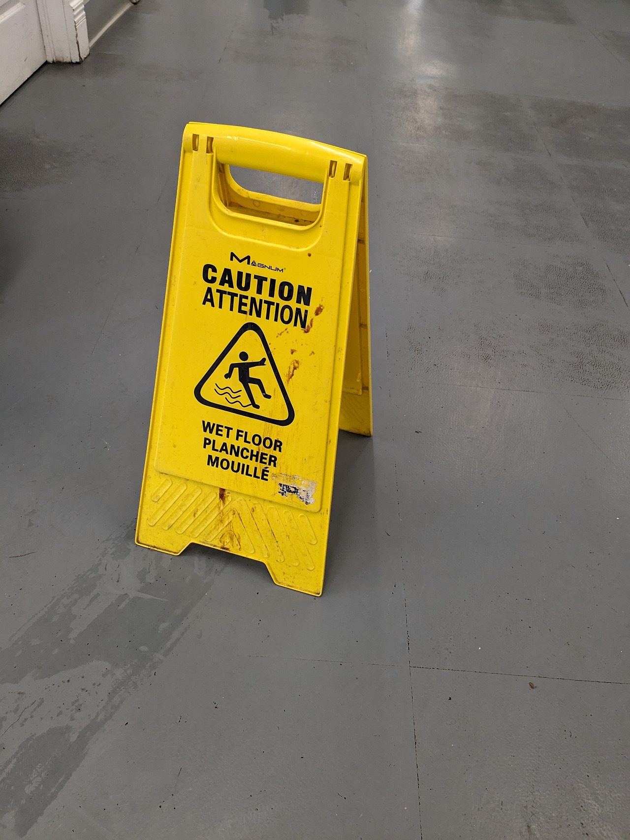 대걸레 한 번 돌렸다면? 무조건 노란 미끄럼 주의 표지판 세운다. 안 그러면 큰일 난다.