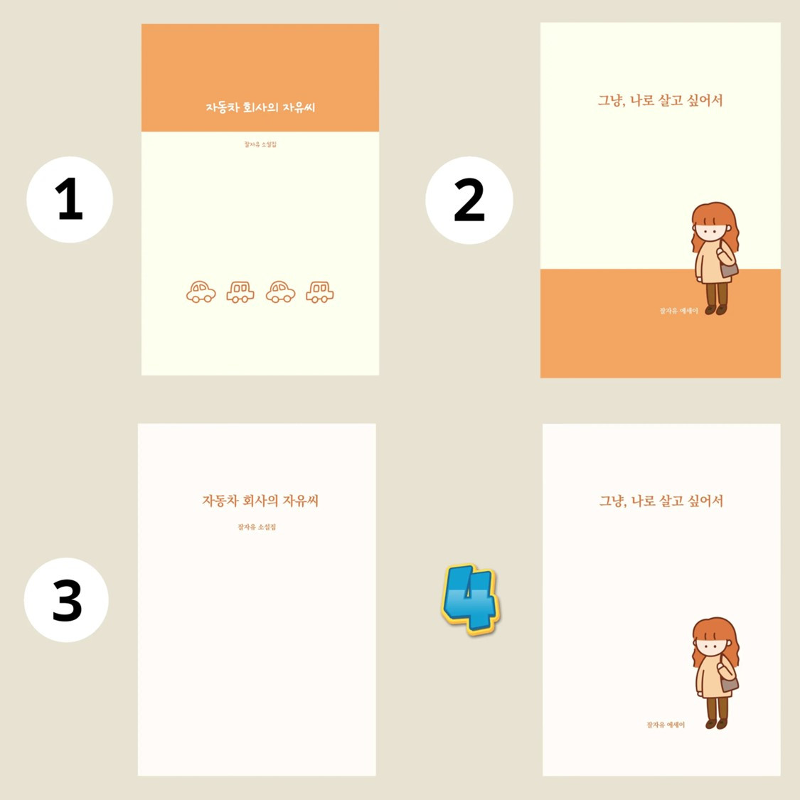 사실 에세이와 소설, 두 개 모두 한 권에 들어간 책이기 때문에 1번과 2번 표지를 모두 사용했어요! 대신 텀블벅 메인 썸네일에는 투표에서 1등을 한 2번 표지를 넣었답니다 ☺