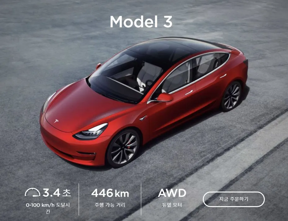 전기차 하면 테슬라! 테슬라 전기차 중에서도 그나마 가격이 싼 모델을 꼽자면 테슬라 모델 3가 있지. 원래 테슬라 전기차는 보조금을 받을 수 없었는데 테슬라 모델 3부터는 보조금 지원을 받을 수 있다고 해. 보조금 지원을 받으면 4천만 원 후반에 살 수 있어. 테슬라 모델 3 EV는 한번 충전으로 최대 352km 달릴 수 있고 최대 출력 175.0Kw, 최대 속도 225km/h, 제로백 5.6초의 성능을 지녔지. 정말 갖고 싶은 차 중에 하나인 것 같아.