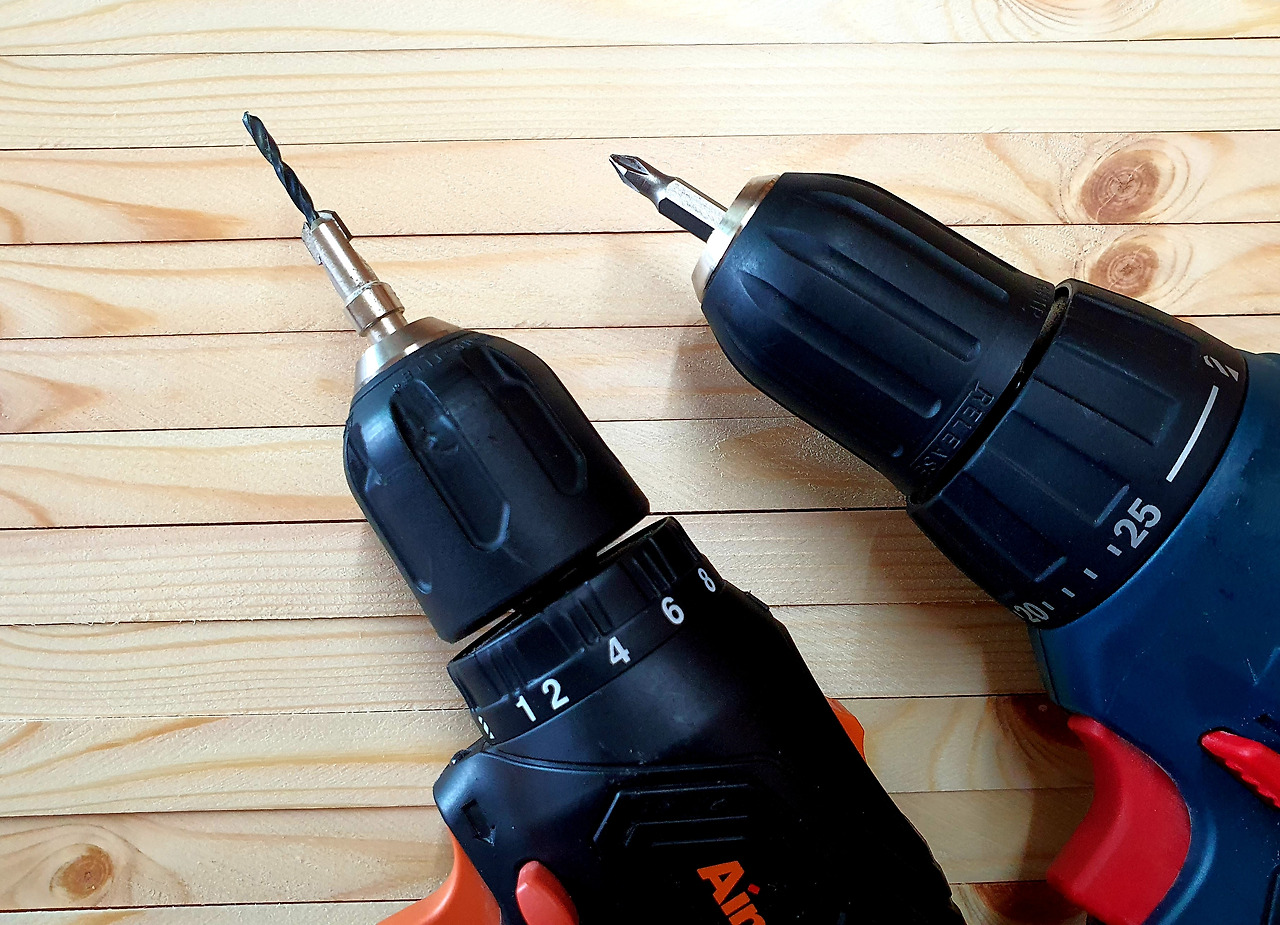 왼쪽이 못 길을 미리 뚫어주는 드릴비트, 오른쪽이 나사못을 조여주는 드라이버 비트가 장착된 전동드라이버,