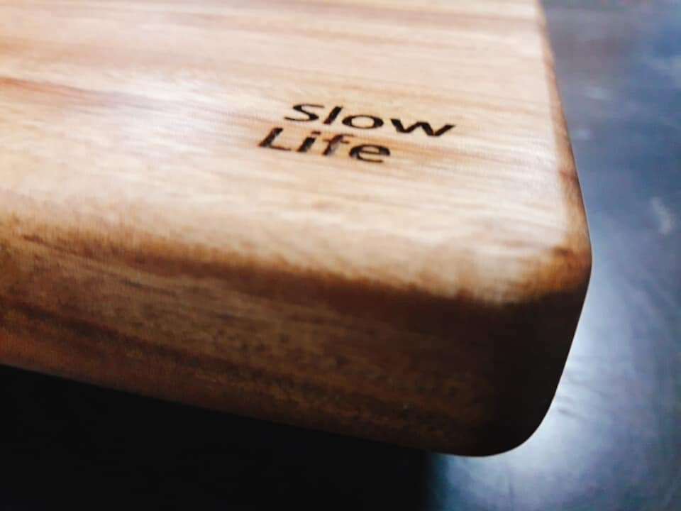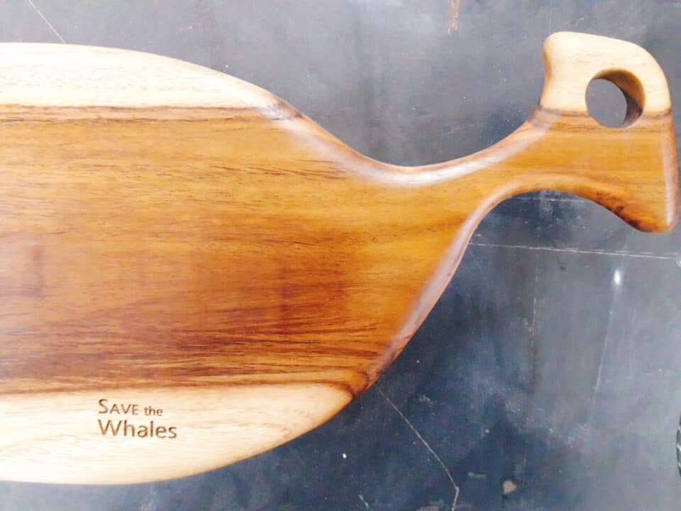 트리머를 이용해 둥글게 다듬은 원목 도마 모서리