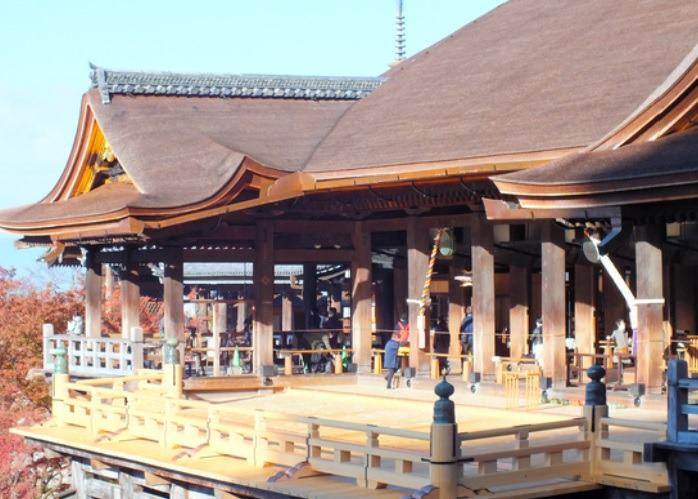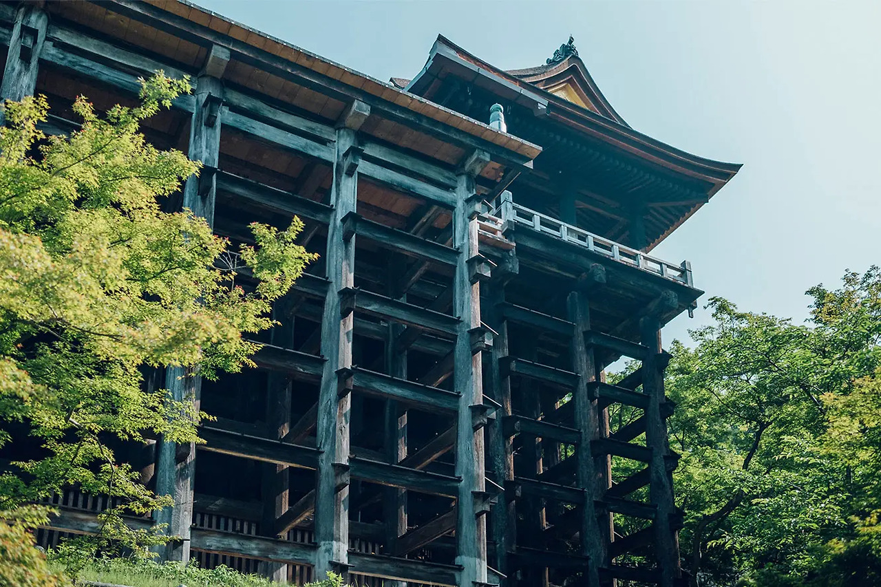 ‘기요미즈의 무대’는 청수사 본당에 달린 테라스 같은 곳으로 13미터나 되는 절벽 위에 세워진 공간을 말한다. 법회나 공연을 하는 곳인데 절벽 위에서 앞으로 툭 튀어나와 있는 전망대를 상상하면 이해가 쉽다. 이 ‘기요미즈의 무대’는 절벽 아래 바닥의 지형을 그대로 이용해 세워졌는데, 수령 400년이 된 거대한 '느티나무(欅)' 기둥 18개를 세우고 다시 가로로 보를 엮어서 종횡으로 서로 지지하고 있는 구조다. 이걸 ‘가케즈쿠리 (かけづくり)’라고 부르는데 쇠못이던 나무못이던 못은 일절 사용하지 않고 목재끼리 서로 받쳐주는 일본의 전통 건축공법이다. 지금의 모습은 1633년에 재건한 것이라고 한다.