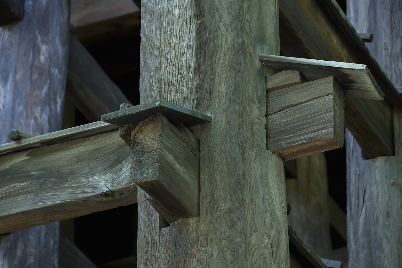 '기요미즈의 무대'를 지지하는 느티나무 기둥 / 목재 결합부에 올려진 작은 나무판은 빗물 침투를 방지하는 역할을 한다. (이미지 출처 - 기요미즈데라 공식 홈페이지)