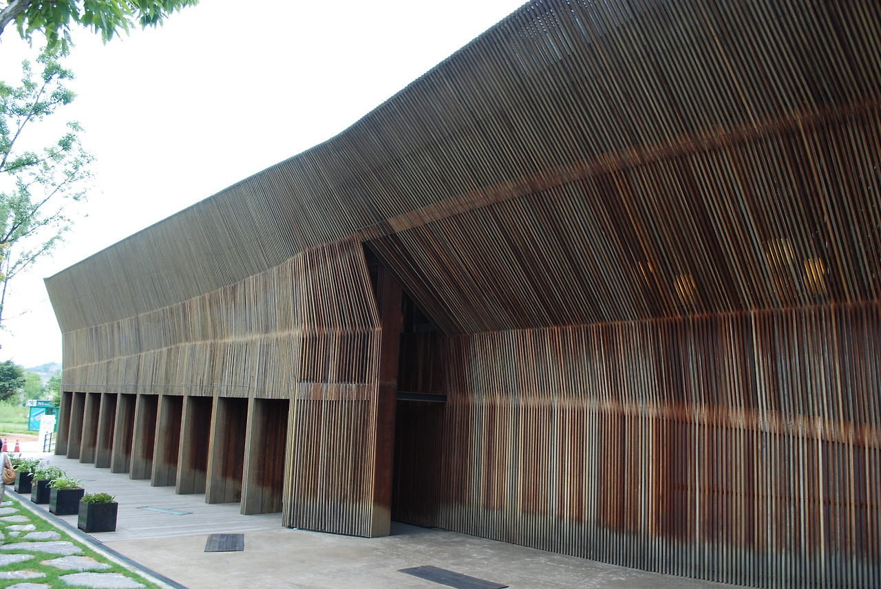 경기도 파주 헤이리 마을의 '한길 북하우스' 멀바우 벽을 감싼 우드 루버가 인상적이다.