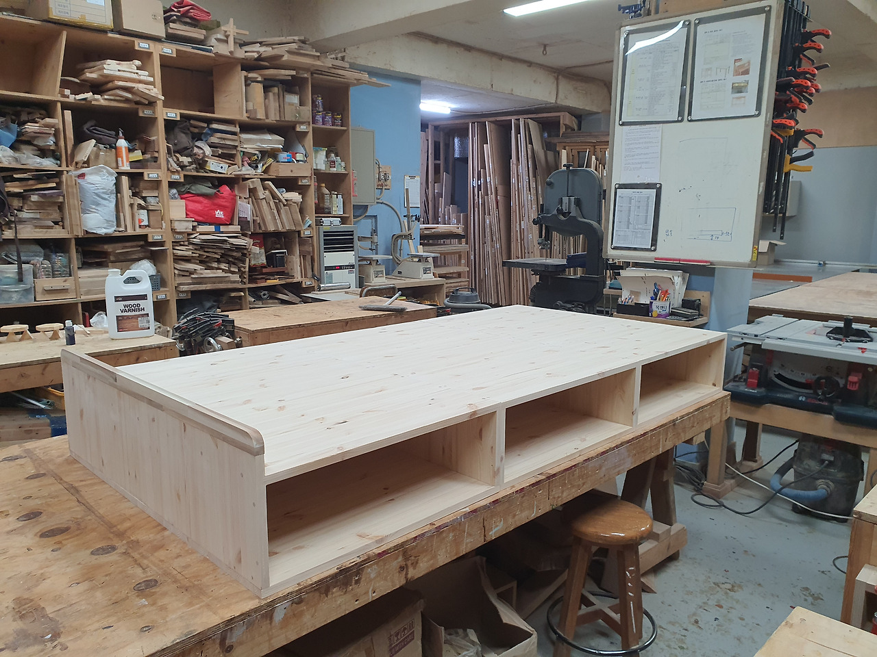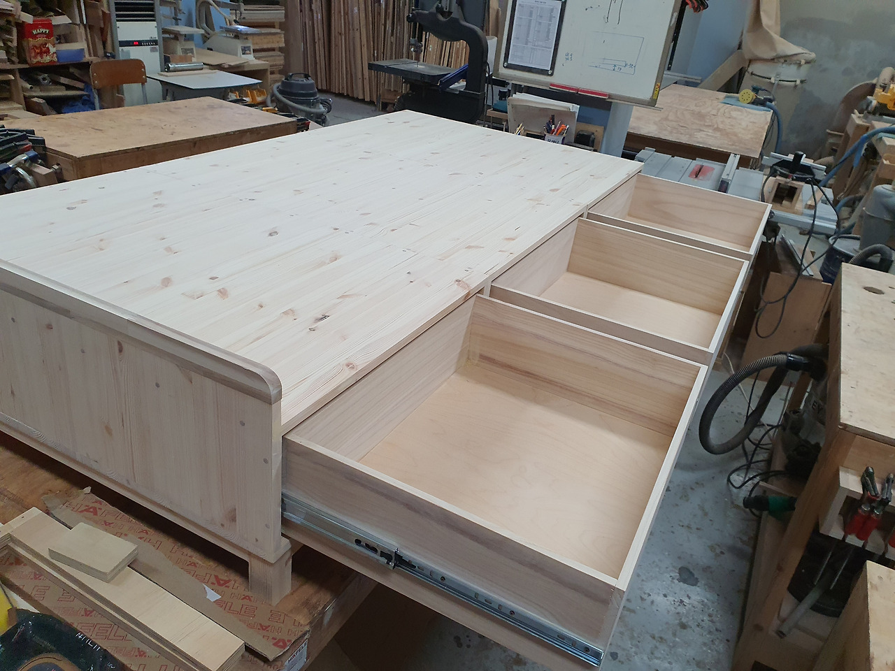 제작 돌입. 기본 프레임은 박스 구조이므로 제작에 큰 어려움은 없었다. 그런데 막상 박스형태 3개를 다 만들고 나서 서로 연결해 보니 이게 무슨 일! 3개가 딱 직사각형이 되지 않고 살짝 기울어지는 것이다. 박스 중 하나가 직각이 제대로 맞지 않았기 때문이다. 거의 하지 않는 실수인데 쉬운 작업이라고 방심했다. 결국 하나는 다시 제작. 다음 작업은 서랍 만들어 넣기. 일단 무게를 좀 줄이고자 서랍 안쪽은 ‘레드 파인’으로 만들지 않고 ‘오동나무’를 사용했다. 이 나무는 처음 사용해 봤는데 가볍고 제작이 쉬운 편이다. 이건 무난히 통과. 서랍의 손잡이가 좀 고민이었는데 결국 동그란 구멍을 파고 다른 색상의 손잡이를 안쪽으로 밀어 넣는 디자인을 택했다. 매트리스 아래 부분이어서 손잡이가 돌출되어 있으면 사용하다 발이 걸리는 일이 생길 수도 있기 때문이다.
