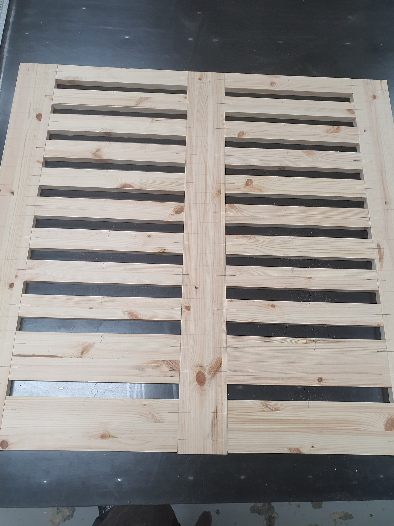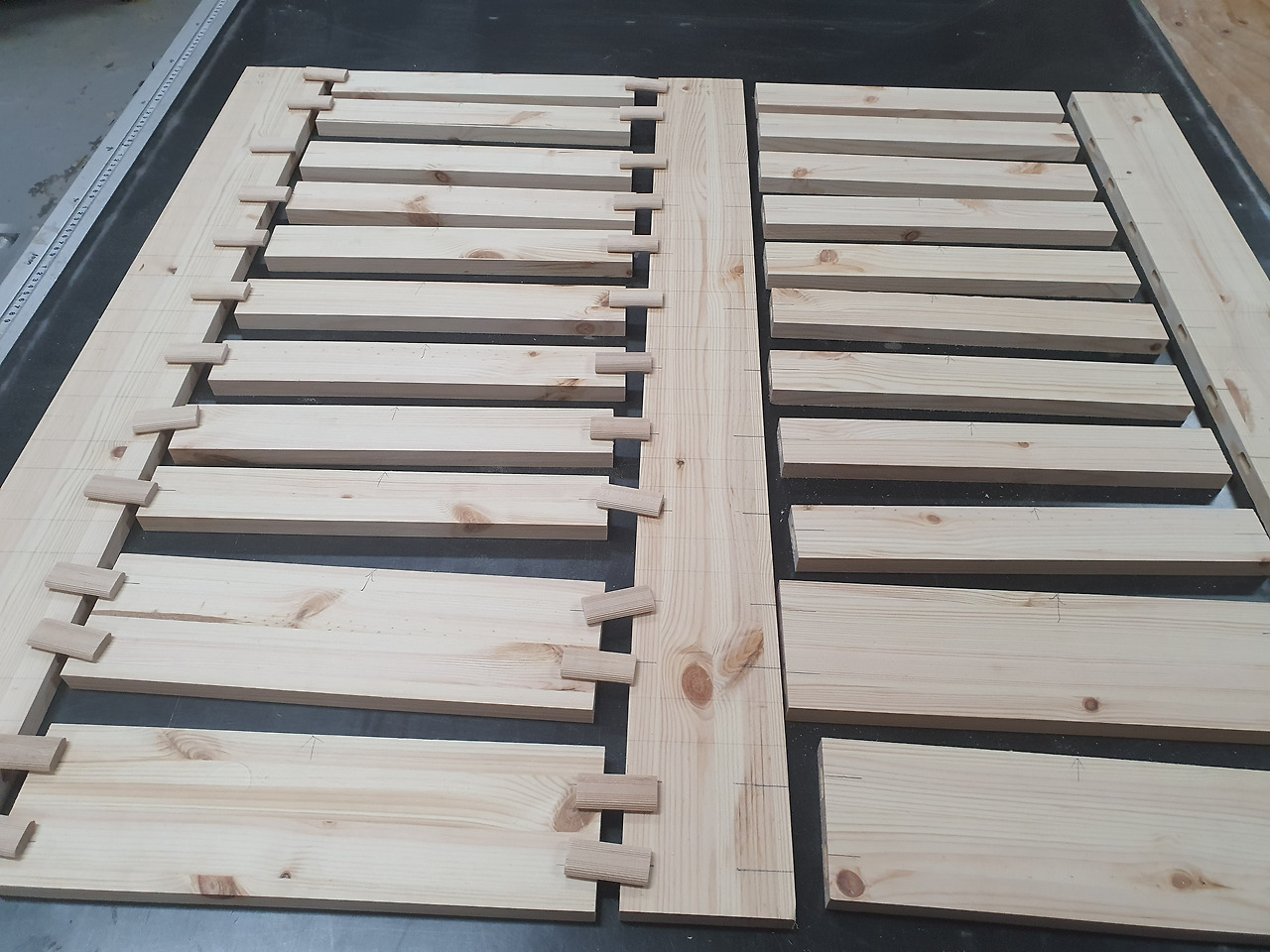 이번 작업에서 제일 어려운 부분은 침대의 헤드다. 3개의 기둥을 세우고 이 사이를 22개의 좁고 길게 재단한 나무로 연결하는 것이다. 창살이 많은 창문을 제작하는 것과 같은데 ‘도미노 조이너’를 이용해 기둥 부위와 각각의 빗살들에 도미노칩을 넣을 구멍만 78개를 뚫었다. 문제는 이게 하나씩 순서대로 조립할 수 있는 게 아니고 한 번에 딱 맞아떨어져야 한다는 것이다. 만약 실수가 있어 잘 되지 않는다면? 최악의 경우에는 처음부터 다시 제작이다. 재단한 목재를 펼쳐 놓고 각 구멍마다 목공풀을 넣었다. 여기에 도미노 칩을 넣고 한 번에 딱 조여서 맞으면 된다. 은근히 긴장되는 순간이었다. 결과는? 아주 아주 아주 다행이었다.