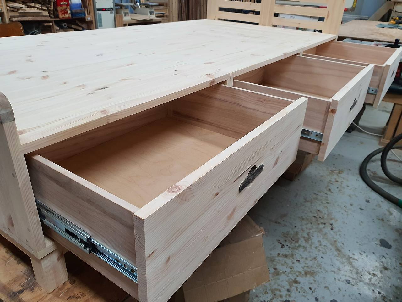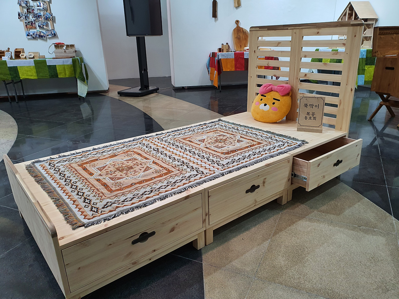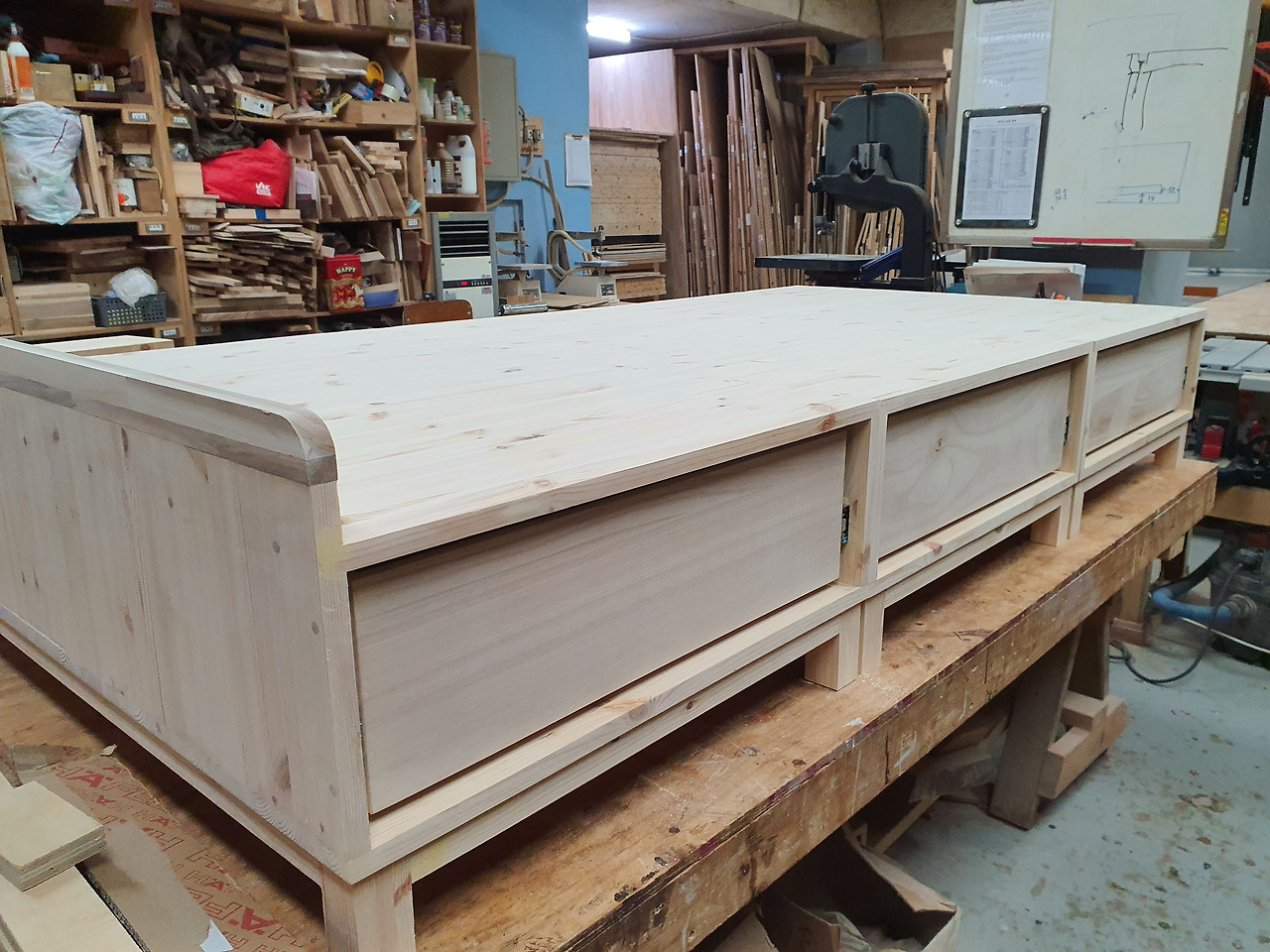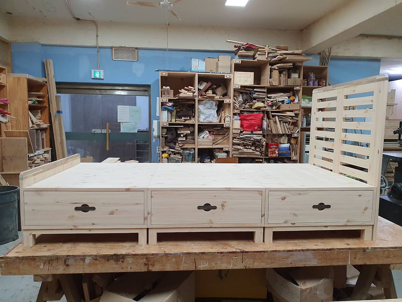 가장 큰 특징은 침대를 3 분할해서 제작하는 것. 2,000mm를 통으로 만들지 않고 3개의 박스 형태로 만드는 것이다. 각 박스마다 서랍이 있다. 상단부 박스에는 헤드가 설치되고, 하단부 박스에는 매트리스가 밀리지 않도록 돌출부가 있는 것이 차이다. 통으로 만들어도 제작에는 별 문제는 없지만 공방에서 만들어 집으로 가지고 가는데 어려움이 있고, 원목으로만 만들면 무게가 상당하기 때문에 혼자서는 설치도 쉽지 않은 것을 고려한 제법 파격적인 결정이다. 셋으로 나누면 미관상이나 기능상 문제가 없는지 우려하는 분들도 있었는데 실제로는 매트리스가 위에서 눌러주기 때문에 흔들리거나 할 일은 없다.