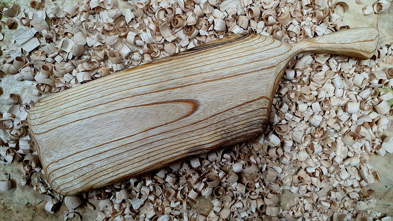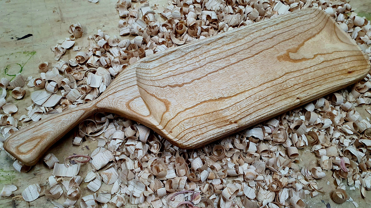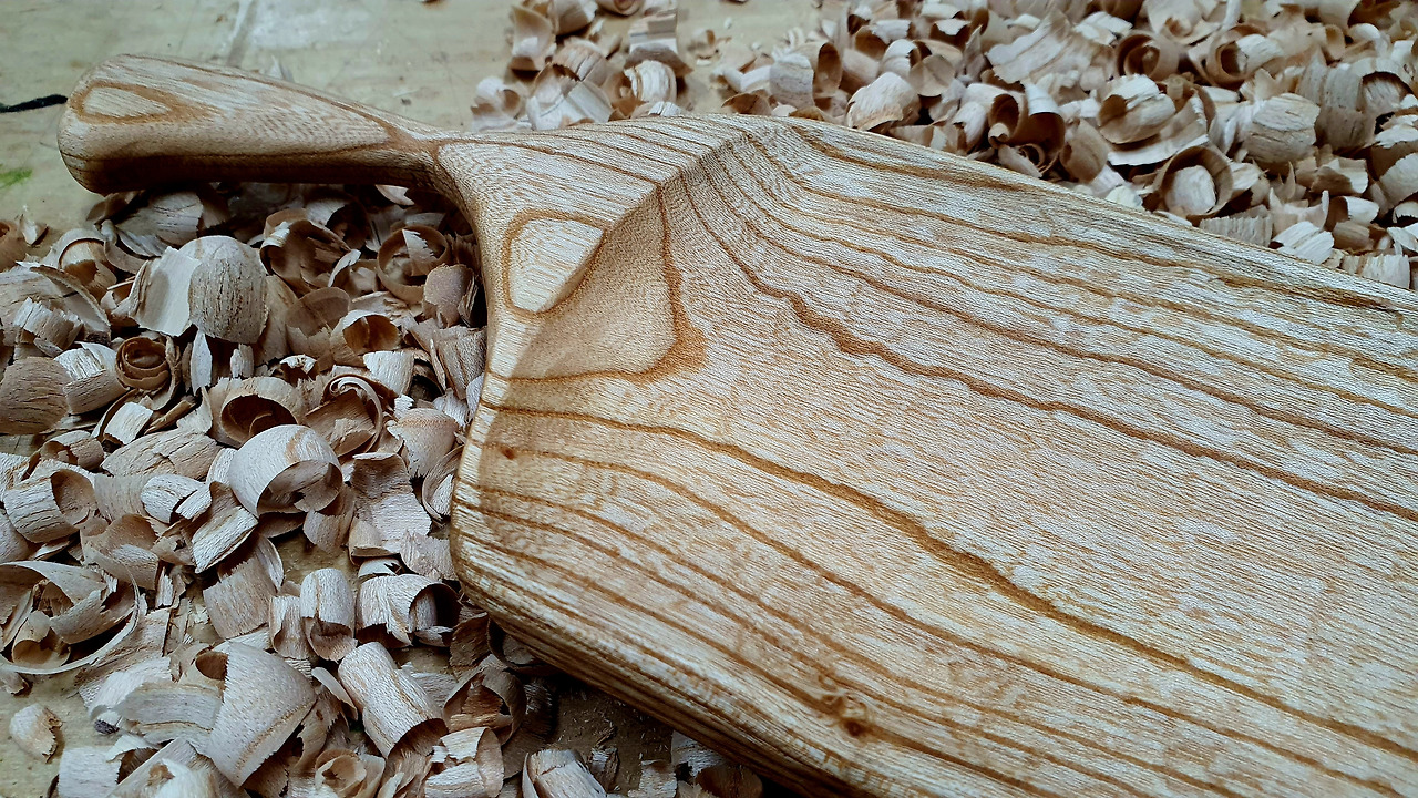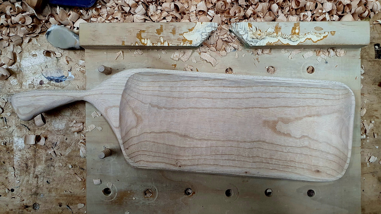 1. 느티나무에 손잡이가 있는 플레이팅 보드 모양으로 윤곽을 그려준다. 안쪽이 오목한 플레이팅 보드를 만드는 것이다. 보통 평평한 도마는 바로 외곽선을 따라 잘라주지만 이번 것은 안쪽을 먼저 파내고 외곽선을 따주어야 작업이 수월하다.