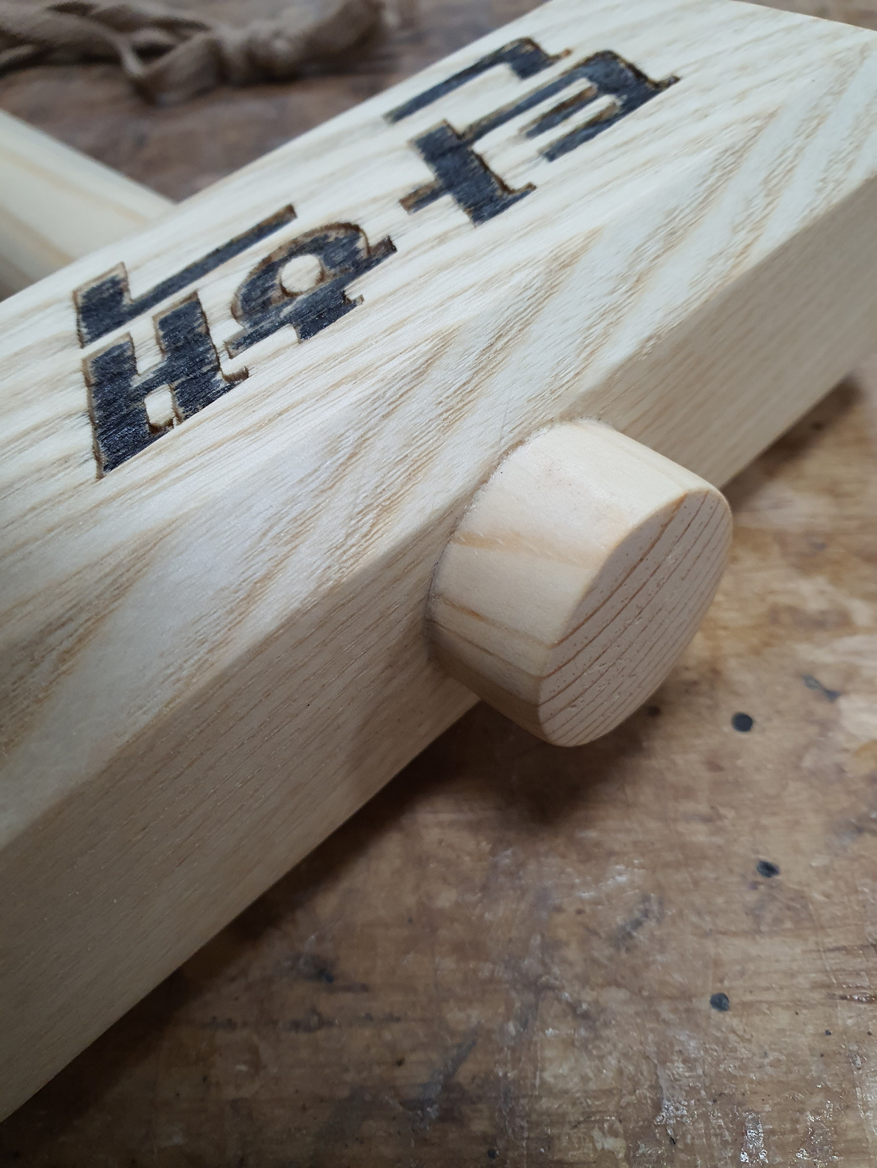 3. 손잡이로 딱 맞는 것이 없어서 사각 각재를 봉으로 가공했다. 부주의로 망치가 획! 날아가버리면 안 되니깐 구멍을 뚫고 손에 걸 수 있는 고리를 걸어 완성!
