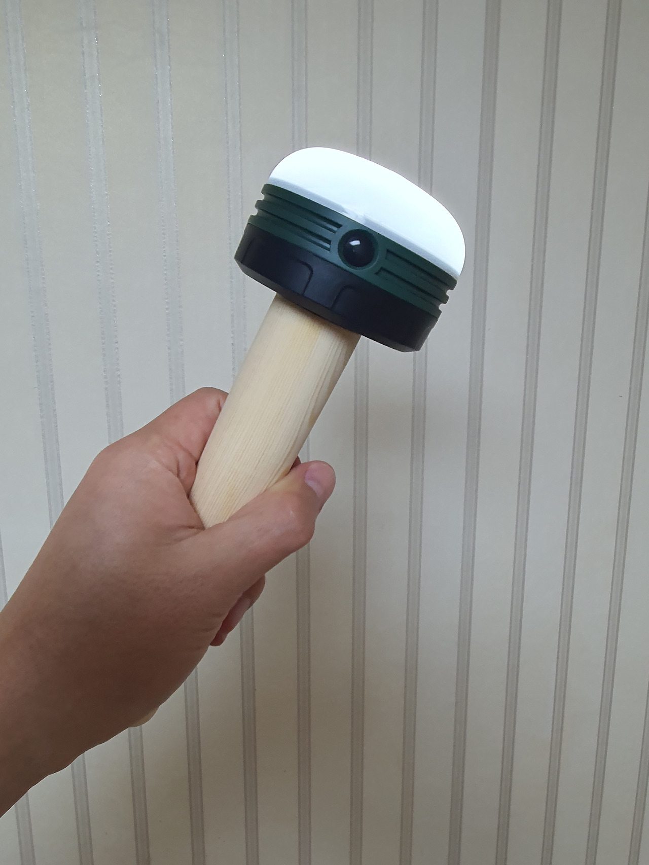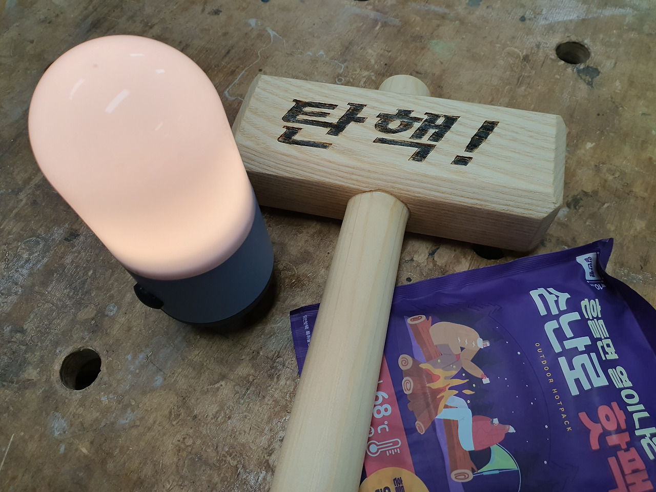공방 회원 한분이 이 망치를 만들어 달라고 하셨다. 딸에게 사진을 보여주었는데 광화문에 갈 때 가져가고 싶다고 했다고. 기꺼이 사용하시라 드렸다. 나는 지난번 들고나갔던 캠핑용 무드등에 목봉을 달았다. 두꺼운 장갑에도 그립감이 좋도록 원뿔형으로 가공했다.