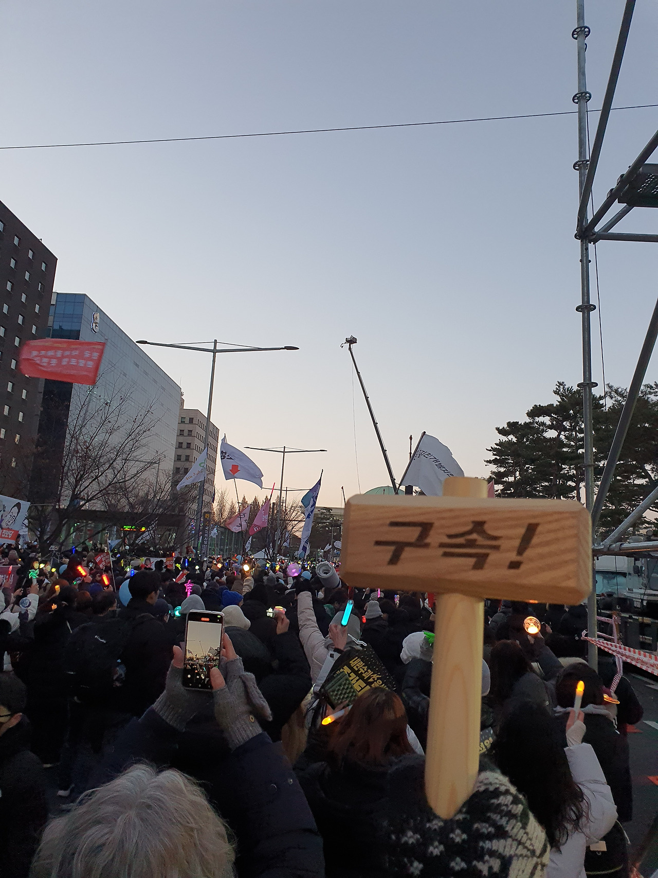 춥고 두려웠던 밤을 견뎌냈으니 더 무리 짓고, 더 비장하고, 더 결연하리라 예상했지만, 이 예상이 틀렸다는 걸 알게 되는데 일각이 걸리지 않았다. 응원봉의 물결은 자유롭게 일렁였다. 각자였으나 혼자가 아니었고 굳건하지만 경직되지 않았다. 비장하지 않았지만 멈추지 않았고 형식이 없었지만 흩어지지 않았다. 나도 내 손에 익숙하고 내 생활이 묻어있는 원목망치를 만들어 들고 동참했다. 반짝이는 응원봉 무리들과 함께 노래에 맞춰 흔들어 본다. ‘소녀시대’를 모르진 않지만 ‘다시 만난 세계’를 쫓아하진 못한다. 망치만 냅다 흔들었다. 다음으로 ‘삐딱하게’가 나왔다. 이건 미리 공부해 두었다. ‘써! 써! 오늘밤은 삐딱하게!’ 정도의 후렴은 같이 할 수 있었다. 이어서 내가 완창 할 수 있는 ‘임을 위한 행진곡’이 나왔다. 목청껏 불러보았다. 옆에 선 청년은 노래를 모르는지, 아니면 어색한지 응원봉만 흔든다. 그런데 노래가 끝나갈 때쯤. 이 청년도 큰 소리로 노래를 따라 부른다. 이 부분만 아는 듯했다.
