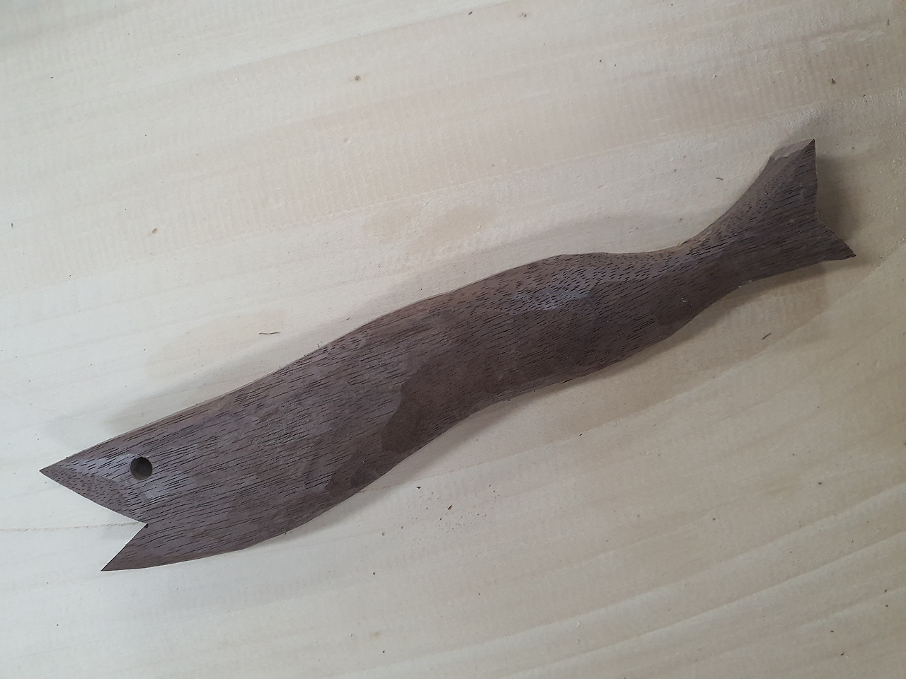2. 몸통 형태를 먼저 깎는다. 눈은 미리 뚫어두고 큰 머리와 마른 몸체에서 꼬리지느러미로 유연하게 이어지도록 작업했다. 위아래 지느러미도 표현해 주어야 완성도가 높아진다.