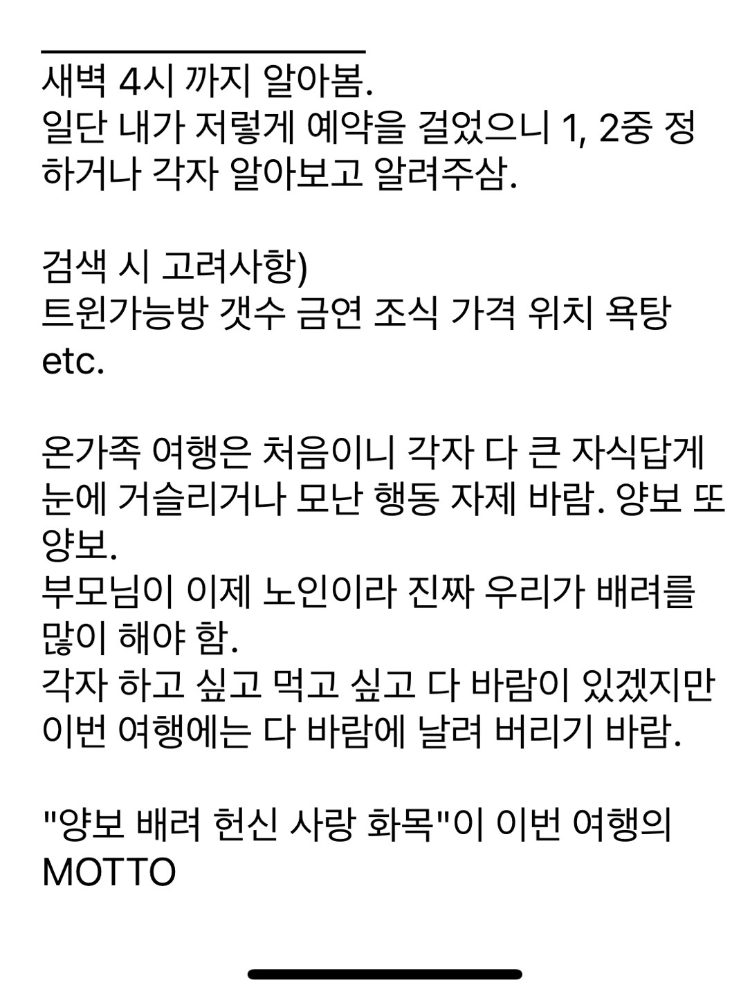 급기야 호텔을 알아보던 남동생은 이른 아침 형제들 단톡방에 다음과 같은 톡을 남겼어요.