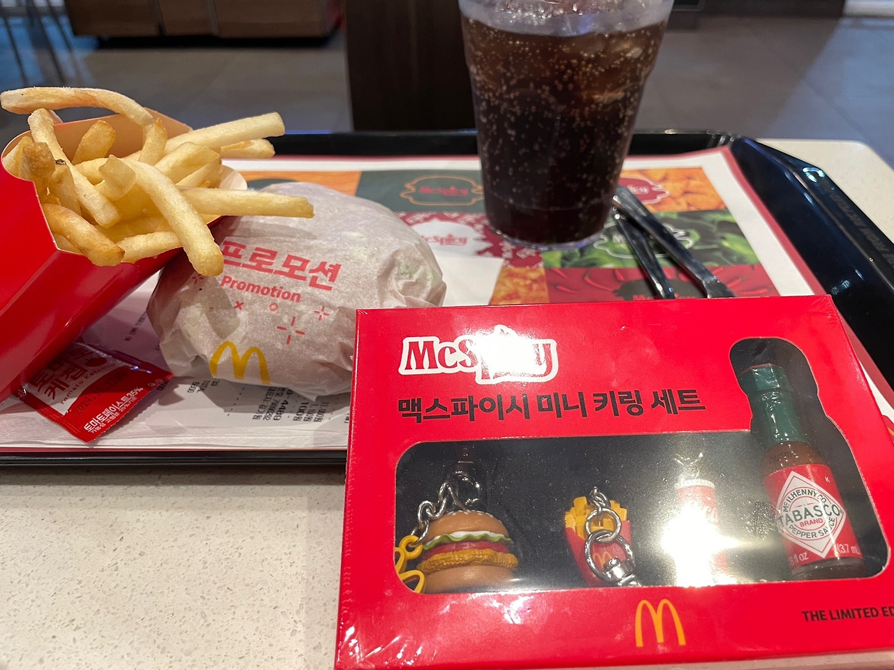 밤 9시가 넘은 시각. 집에 들어오자마자 옷도 갈아입지 않은 남편은 그 길로 차를 몰아 맥도날드로 향했다. 그리고 나는 햄버거 세트 하나를 사 남편에게 먹이는 대신, 마침내 맥스파이시 미니 키링 세트를 손에 넣었다.