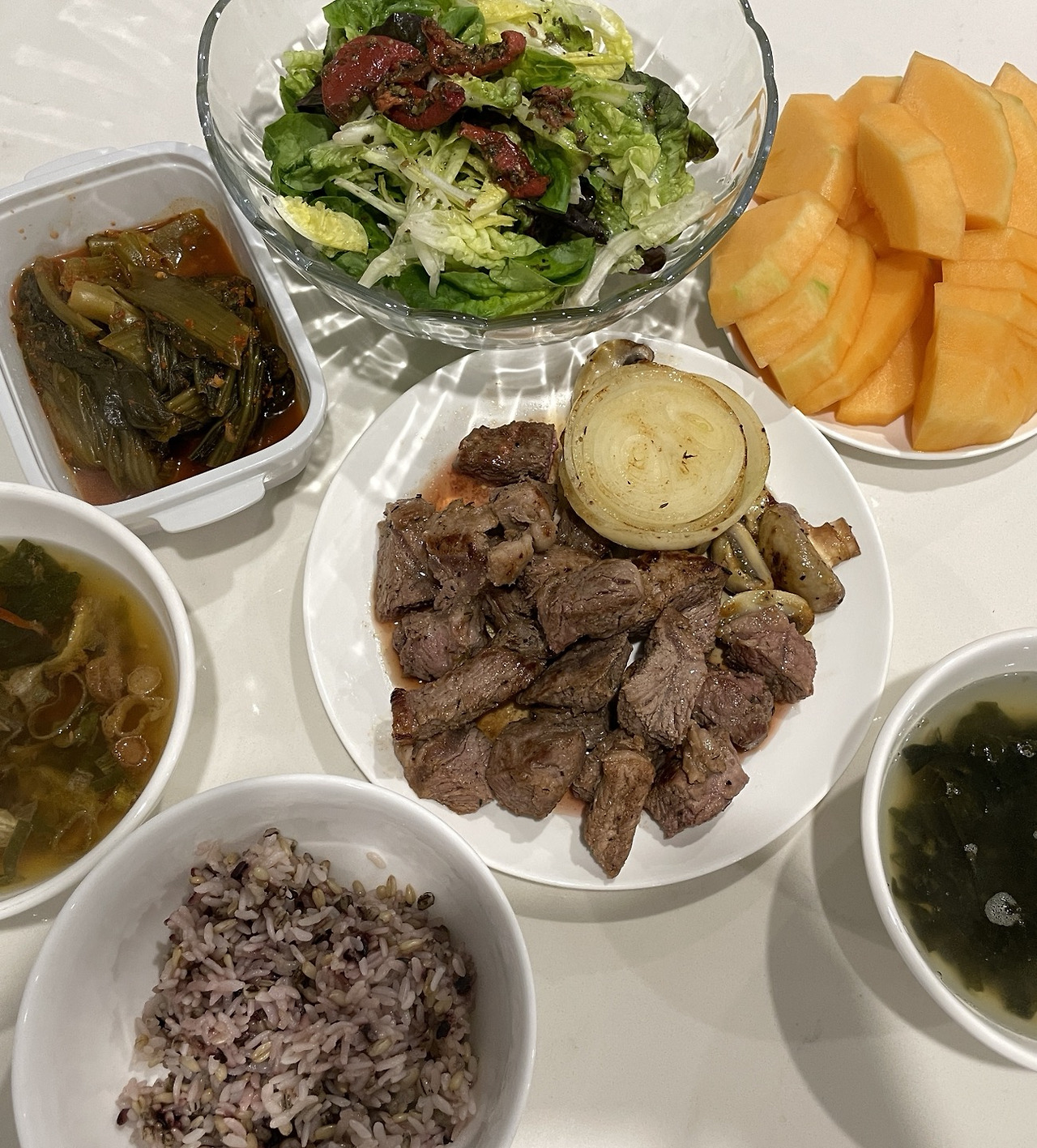 우리는 저렴하고 질 좋은 목초 먹인 소고기와 한국에서 가져온 인스턴트 밥과 국으로 근사한 저녁상을 차렸다.