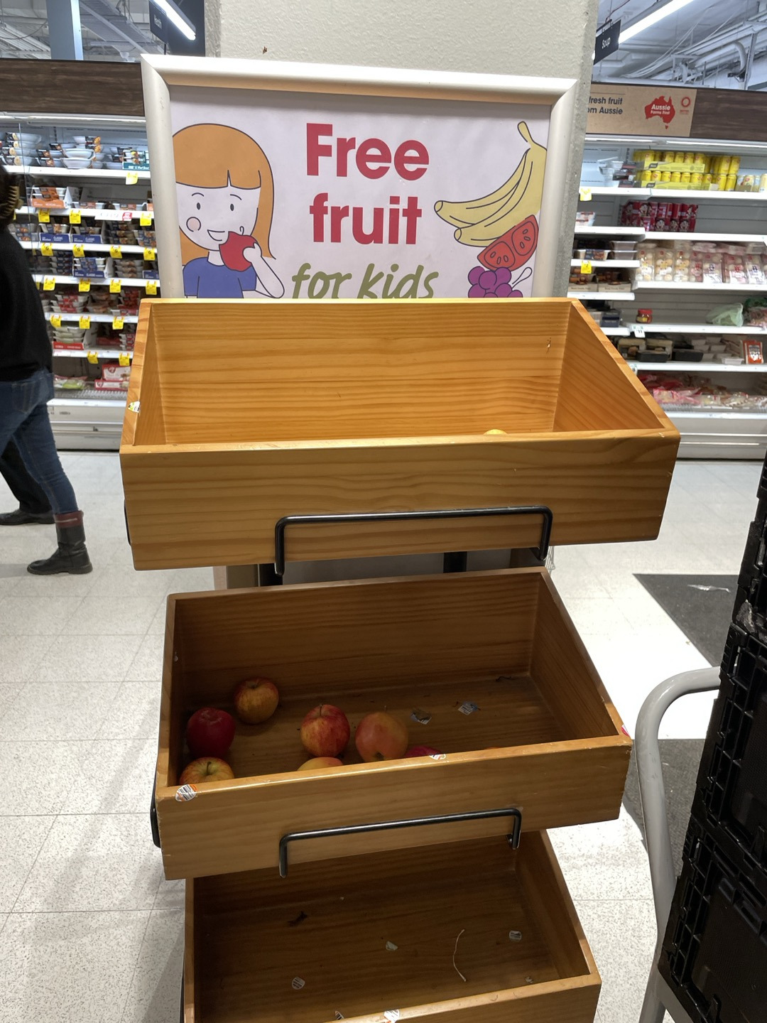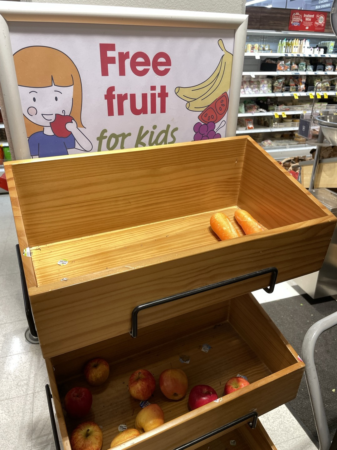 말그대로 엄마아빠와 함께 쇼핑 온 아이들이 바로 꺼내 먹을 수 있게 과일들을 종류별로 가져다 놓은 건데. 사진을 찍은 날은 사과 밖에 없었지만, 바나나도 있고 그때그때 종류도 다양하다. 가격은 물론 공짜.
