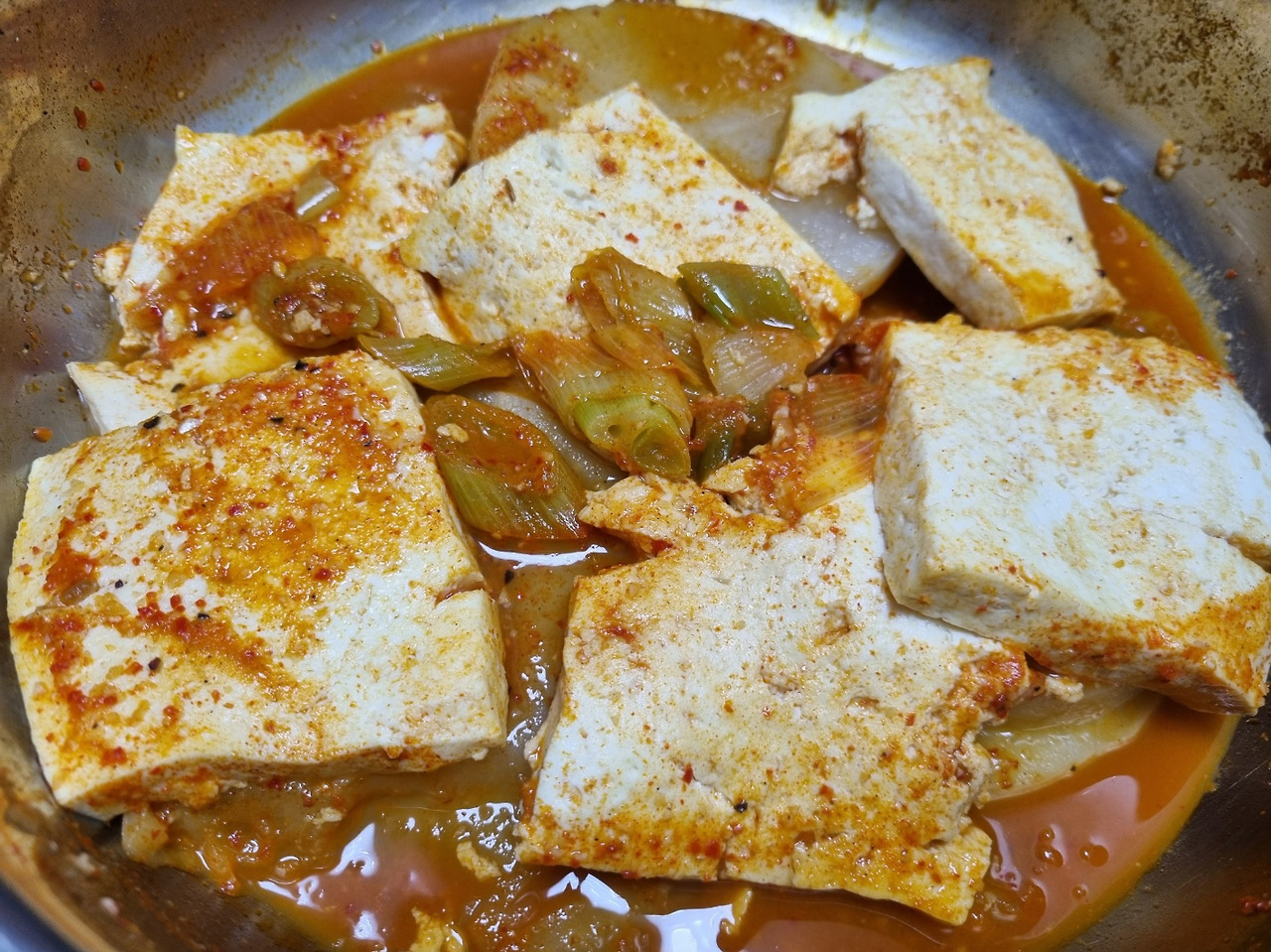 나와있는 레시피대로 고추장, 고춧가루, 간장, 다진 마늘, 후추를 섞어 양념장을 만들어주고 무와 두부를 적당한 두께로 썰어주었다. 무를 썰 때 항상 느끼는 건데 일정한 두께로 써는 것이 좀 어렵다. 하다 보면 이상하게 위쪽과 아래쪽의 두께가 달라진다. 그래서 무를 썰 때면 최대한 집중을 한다. 이번에는 괜찮게 썰어진 것 같아 내심 만족스러웠다. 파는 조금 두껍게 어슷 썰고 두부는 노릇하게 부쳐주었다. 정수물에 3~4시간 정도 우려낸 다시마 채수에 무를 넣고 무가 익을 때까지 끓인 다음 두부, 양념장, 파를 넣고 푹 조렸다. 중 약불에 두고 중간중간 눌어붙지는 않았는지 확인하면서.