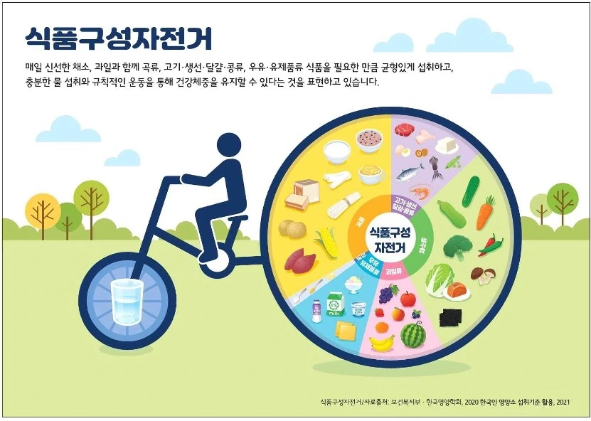 앞서 살펴본 것처럼 에너지 균형을 유지하는 것은 신체 건강에 매우 중요하다. 보건복지부에 서는 식품구성 자전거의 개념으로 균형 있는 영양섭취의 중요성을 강조하고 있다. 우리가 탄 단지 비율을 계산하는 이유는 하루에 필요로 하는 총 에너지 소비량에 맞춰 탄수화물, 단백 질, 지방의 에너지 비율을 할당함으로써 균형 있는 음식을 섭취하기 위함이다.