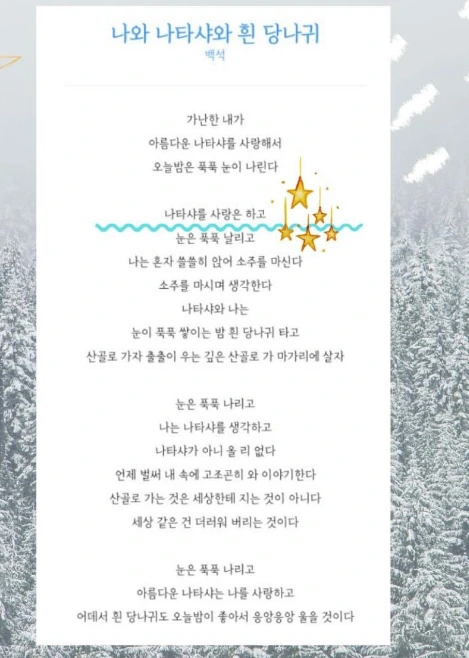 특히 나의 마음을 사로잡은 마성의 대목은 ‘나타샤를 사랑은 하고’이다. 지금도 이 문장을 사랑한다.
