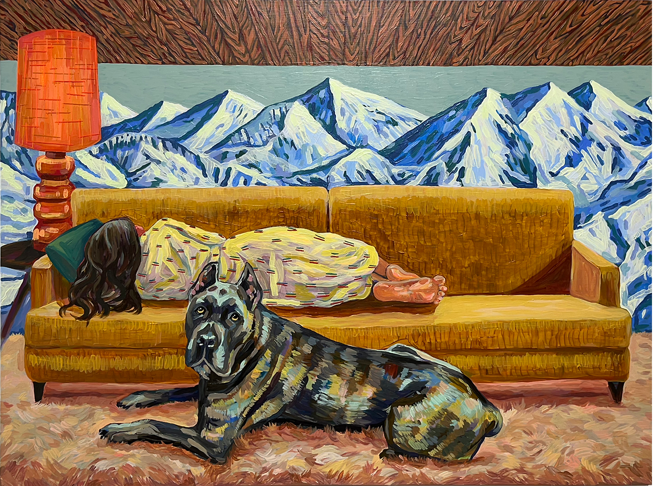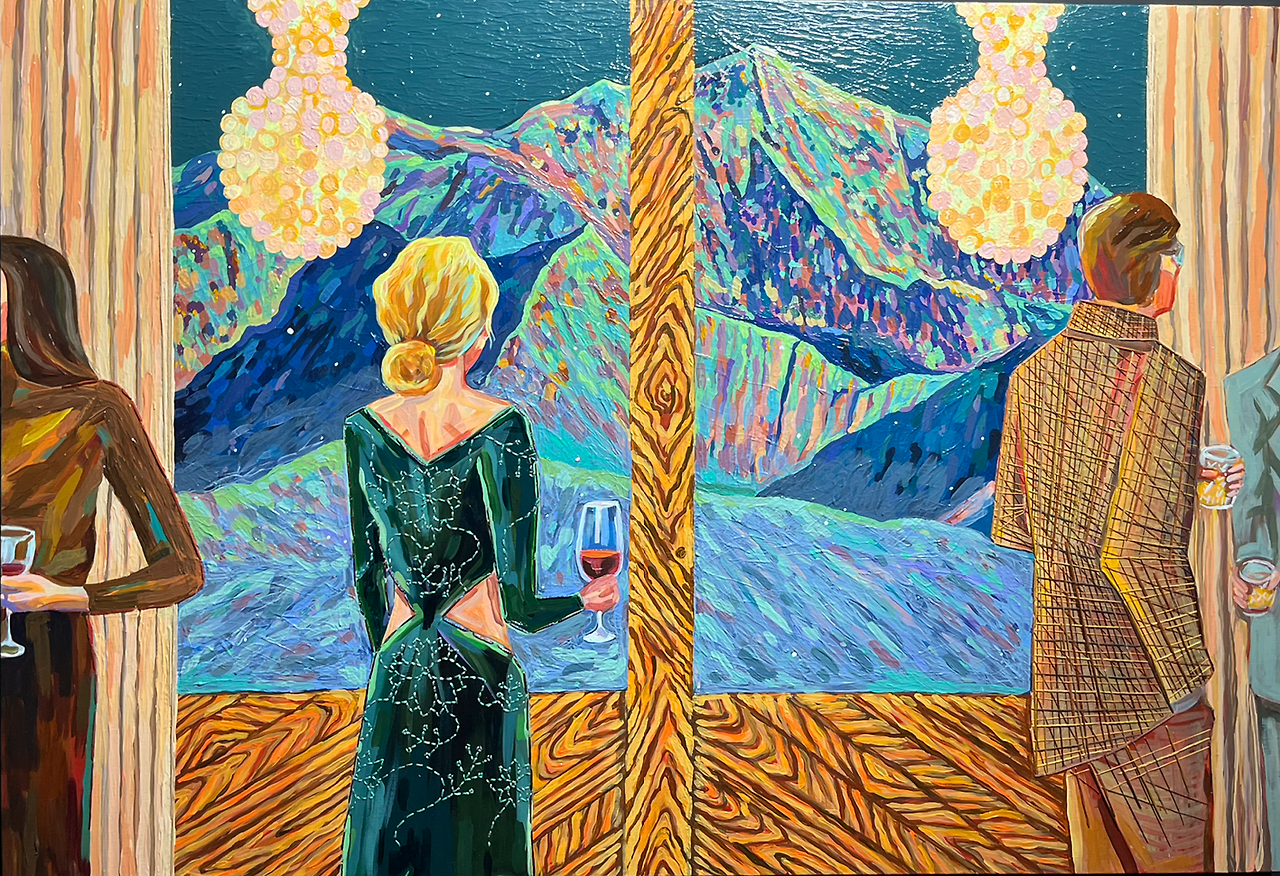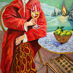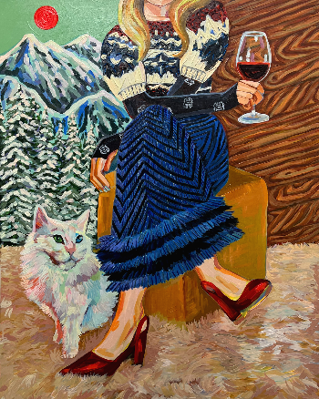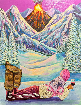 화산이 폭발 중인 설산을 불구경하듯 바라보며 비비드 한 점퍼의 여인은 화산처럼 붉은 와인을 즐기고 있다. 제목은 'Whipped Cream Daydream'.