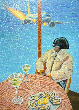 창을 경계로 비행기가 추락 중인 상황에 시크한 선글라스를 낀 여인은 홀로 여러 잔의 마티니를 즐기고 있다. 제목은 'A Time for Martinis'.