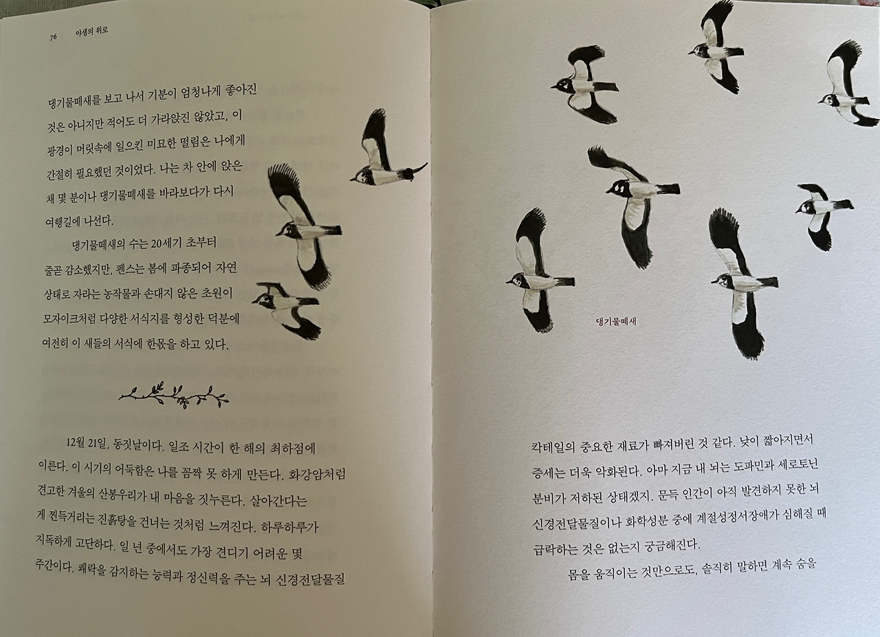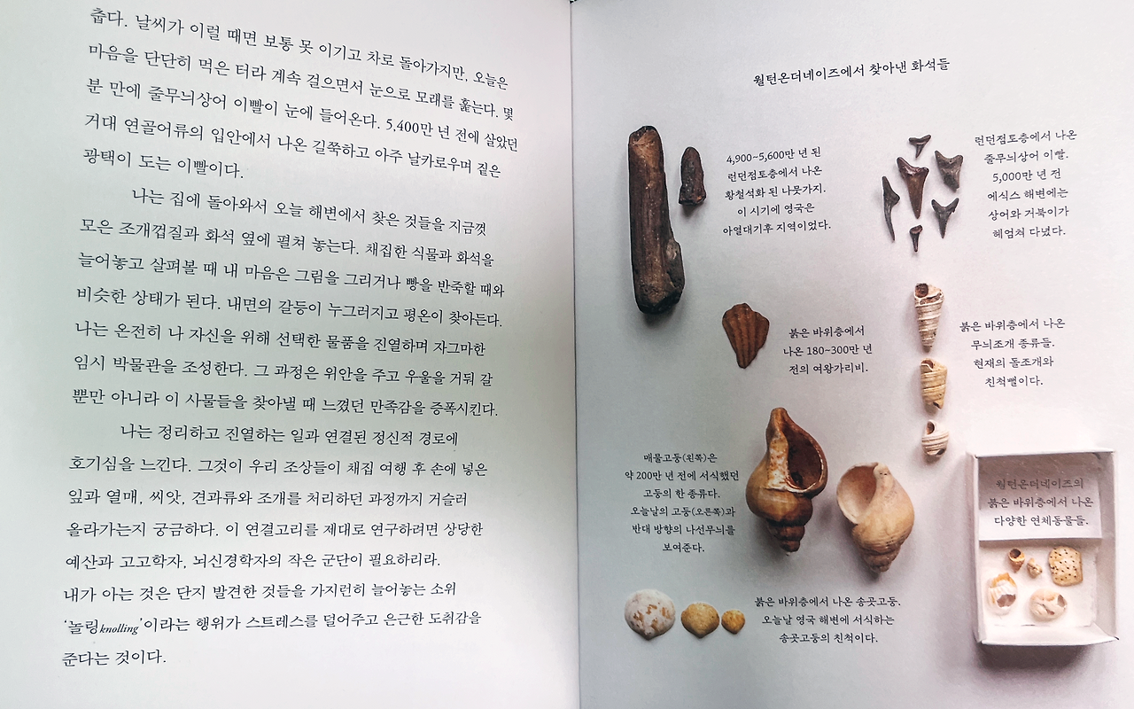 내가 오늘날 낙엽을 주워 모으며 느끼는 기분은 그러한 본능의 흔적일지도 모른다. 이 뿌듯한 감정의 진화적 근거가 무엇이든 간에, 이런 행동이 내 뇌의 화학적 균형을 미세하게 조정하는 데 도움이 되는 건 확실하다. 나는 화사한 낙엽 카펫 옆을 서성이며 마법 같은 항우울 효과가 나타나길 기다린다. 햇살이 따스하다. 눈부신 빛깔들 속에서 보낸 몇 분이 기분을 돋워주어 정말로 입안에 상큼한 맛이 느껴질 것만 같다. P37