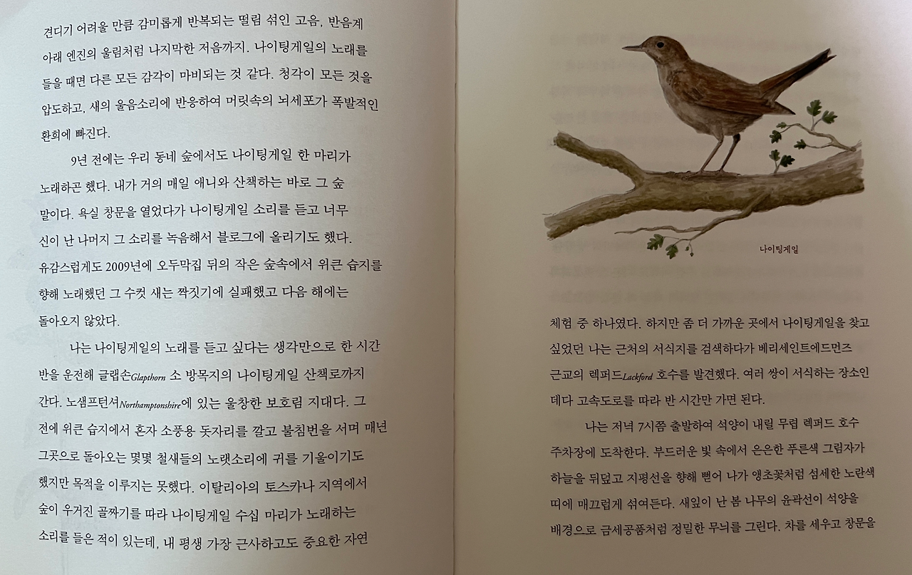 나는 그곳에 책상다리를 하고 앉아 블루벨을 바라본다. 햇살과 풍요로운 꽃들이 시야를 가득 채우고 뇌세포에 이른다. 최고로 맛있는 초콜릿 케이크나 집에서 만든 짭짤한 감자칩을 먹을 때 같은 강렬한 만족감이 퍼져 나간다. 마치 내 마음이 이 광경을 먹어 치우고 거기서 양분을 취하는 것 같다. P168