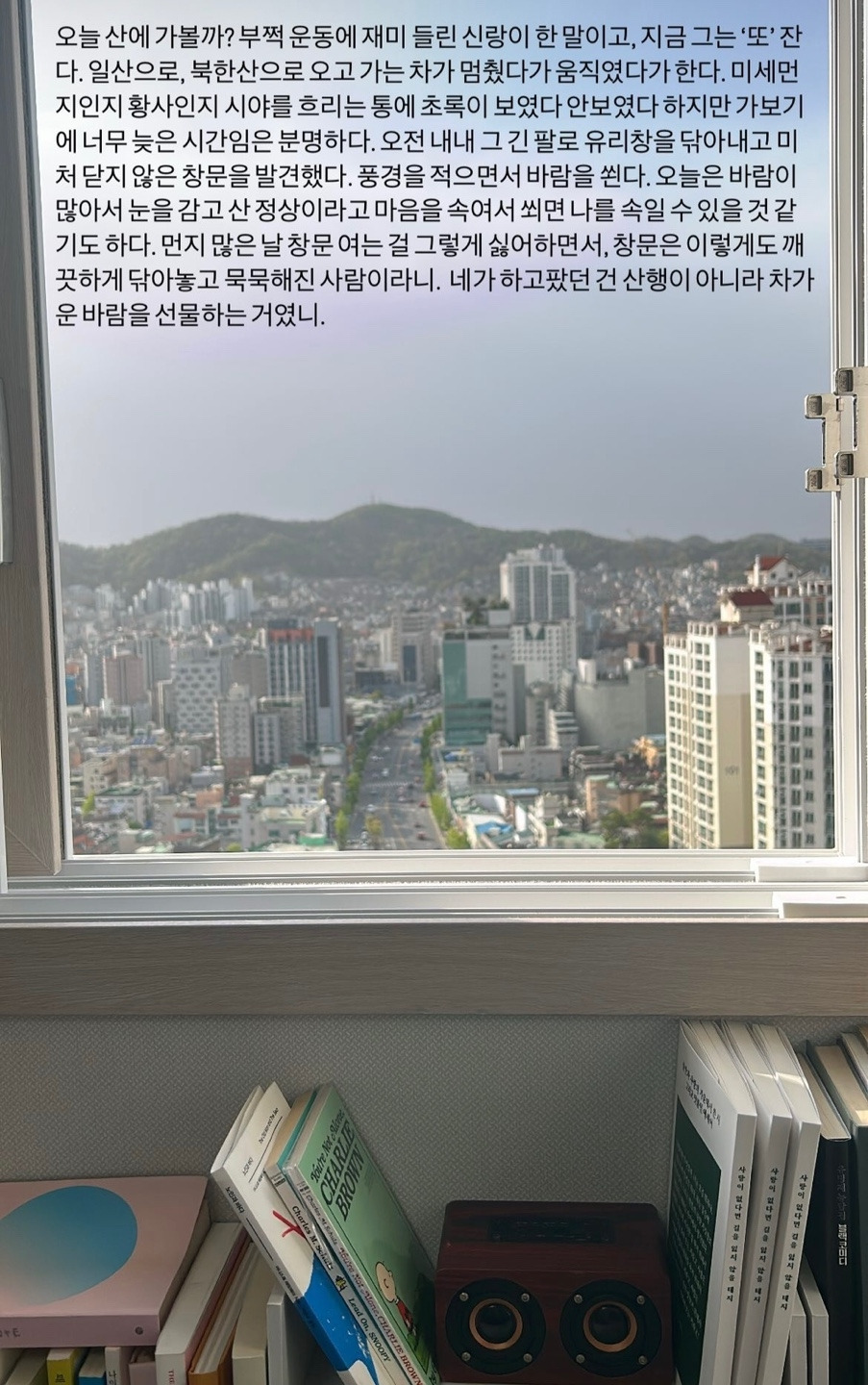오늘 산에 가볼까? 부쩍 운동에 재미 들린 신랑이 한 말이고, 지금 그는 또' 잔다. 일산으로, 북한산으로 오고 가는 차가 멈췄다가 움직였다가 한다. 미세먼지인지 황사인지 시야를 흐리는 통에 초록이 보였다 안보였다 하지만 가보기에 너무 늦은 시간임은 분명하다. 오전 내내 그 긴 팔로 유리창을 닦아내고 미처 닫지 않은 창문을 발견했다. 풍경을 적으면서 바람을 쐰다. 오늘은 바람이 많아서 눈을 감고 산 정상이라고 마음을 속여서 쐬면 나를 속일 수 있을 것 같기도 하다. 먼지 많은 날 창문 여는 걸 그렇게 싫어하면서, 창문은 이렇게도 깨 끗하게 닦아놓고 묵묵해진 사람이라니. 네가 하고팠던 건 산행이 아니라 차가운 바람을 선물하는 거였니.