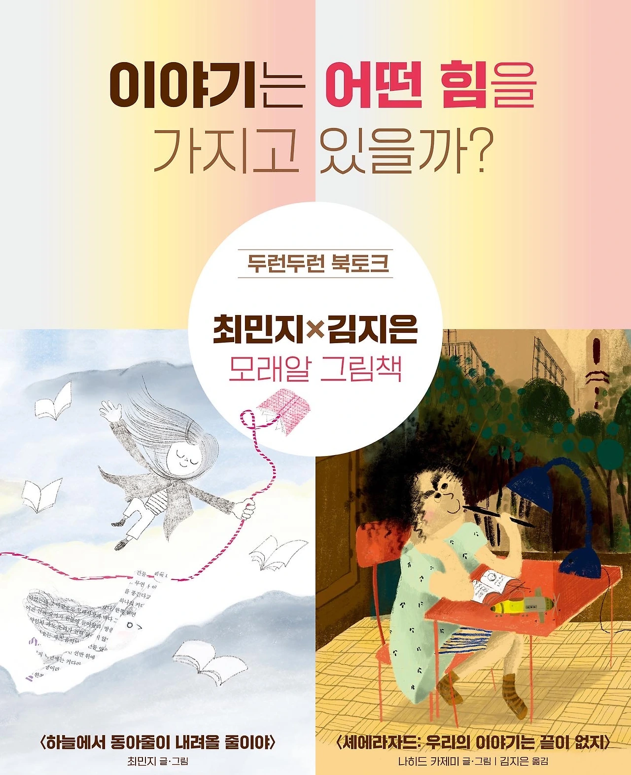 <하늘에서 동아줄이 내려올 줄이야>와 <셰에라자드: 우리의 이야기는 끝이 없지>는 이야기와 함께 살고, 이야기의 힘을 믿는 우리의 이야기가 담긴 그림책입니다.
