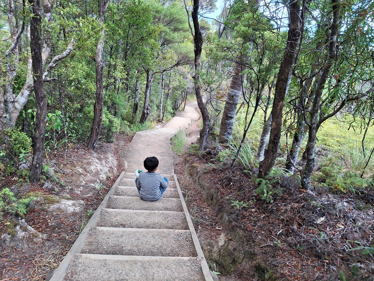 내려가는 길에 잠깐 쉬고 있는 아이. 호주에서 산 뱀 인형과 함께.
