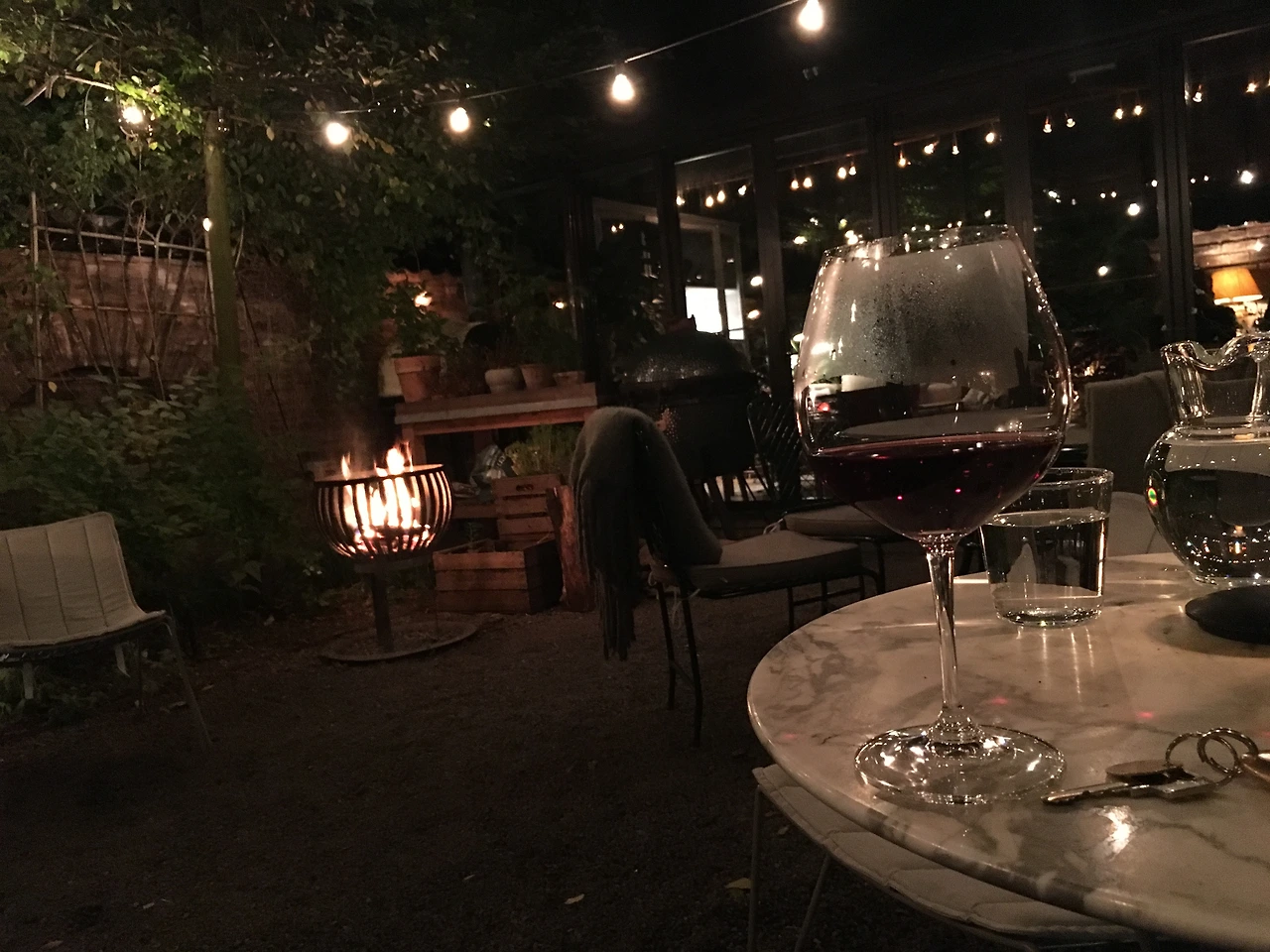호텔 안으로 향하는 돌계단을 오르기 전 눈 앞에 펼쳐진 광경에 영혼을 빼앗긴다. 정원의 좌우편으로 마치 액자 프레임처럼 푸른 나무가 우거져 있고, 그 아래로 귀여운 원형 테이블과 포근한 의자가 몇몇 놓여있다. 이 장면이 완벽해질 수 있었던 건 테이블 곁 동그란 모닥불이었다. 정겹게도 타오르는 그 적당한 붉은빛과 따스함 곁으로 어서 다가가 여독을 풀며 느슨한 생각에 잠기고 싶더라. 그러다 자연스럽게 시선이 옮겨진 곳은 정원의 맨 안쪽 전면 유리창 안 공간에 모여있는 사람들의 모습이었다. 호텔 레스토랑인 듯한 정원 너머 그곳의 온기가 내게 전해지는 것 같았다. 기다랗고 두터운 원목 테이블에 예닐곱 명의 사람들이 둘러앉아 잔잔한 미소를 띠며 이야기를 나누고 있다. 어디에서나 볼 법한 모습이지만 사뭇 다른 느낌의 차분한 즐거움과 미소가 고밀도로 그 공간에 서려 있다. 테이블 위 레드와인과 화이트 와인이 채워진 잔 그리고 캔들이 저마다의 빛을 내뿜으며 붉은 벽에 부딪혀 정원의 조명과 만난다. 엣헴 정원의 하늘은 오렌지빛이다.