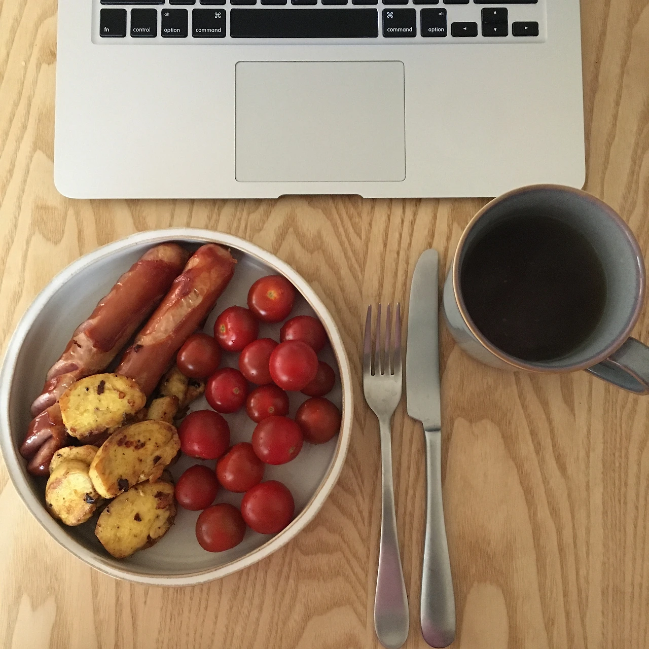 3 어느 날의 점심. 요즘 점심 식사와 최애 메이트는 넷플리스 오리지널 다큐시리즈. 이날은 아마도 소금, 산, 지방, 불 중에서 '불'편을 보았던 기억이 있다. 소시지와 닭가슴살을 굽고 방울토마토를 곁들였다 with coffee.