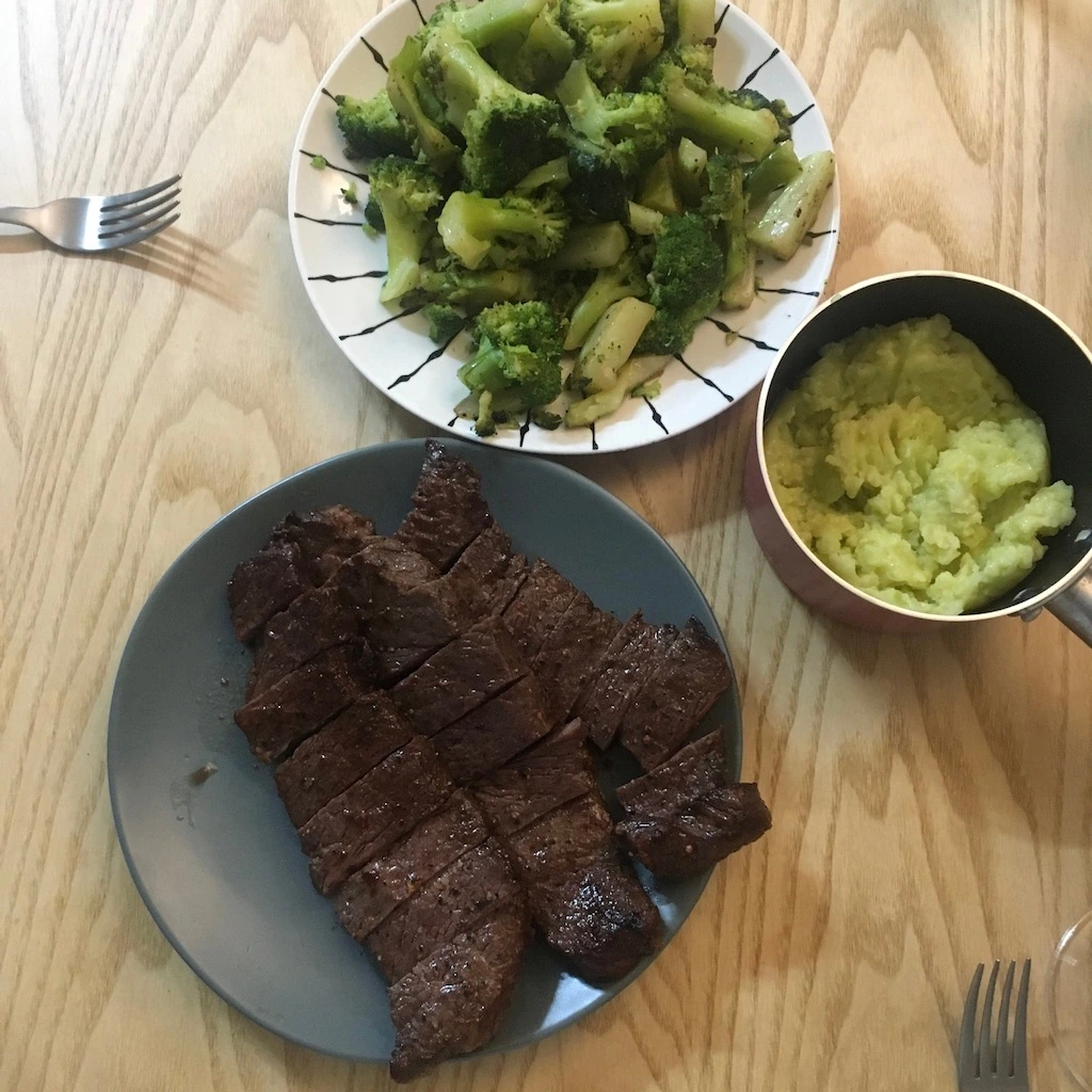 3 브로콜리를 삶고 정말 오랜만에 매시드 포테이토를 만들었다. 편하게 하고 싶어서 밀크팬에서. 감자는 깍둑썰기 해서 용기에 담아 랩을 씌우고 전자레인지에 돌렸다. 포크로 찍힘 정도를 확인하고 밀크팬에 옮겨 버터, 생크림, 감자, 우유 아주 약간을 넣고 계속 저었다. 불에서 내린 후 소금, 후추 휘리릭. 오랜만에 스테이크와 곁들이니 얼마나 꿀맛이던지.