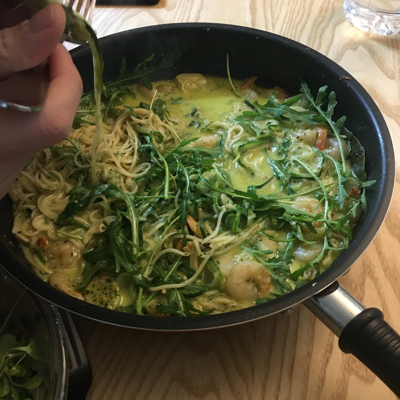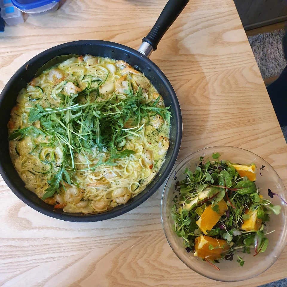 오랜만에 또 실력 발휘했던 어느 날 저녁 식사. 호기심의 발로로 만들어 두었던 시금치 페스토가 있었다(잘했다 잘했다, 셀프칭찬!). 칵테일 새우 해동시켜 올리브 오일 자작하게 팬에 둘러 다진 마늘과 함께 볶아 준 후...그 뒤로는 모두가 아는 그 알리오 올리오 스타일로. 파스타 면 반, 스파이럴 칼로 만든 주키니면 반으로. 마지막에 면수와 생크림을 약간 추가하고 통후추와 파미지아노 레지나오 치즈를 넉넉히 뿌려준 후 불을 끄고 한 10초 후 와일드 루꼴라를 얹어준다. 내가 했지만 어찌나 맛있던지. 소스라기보다 수프가 돼버린 정체를 알 수 없는 저 '국물'을 그는 열심히 전부 다 퍼먹었다. 실은 많은 우연이 모인 레시피였기에 다시 먹고 싶다는데 다시 해줄 방도가 없다, 어쩐담. 샐러드는 루틴대로 하되 이날은 방울토마토 대신 오렌지로. 요즘 오렌지 맛 정말 최고다. 1일 1 오렌지 하는 중.