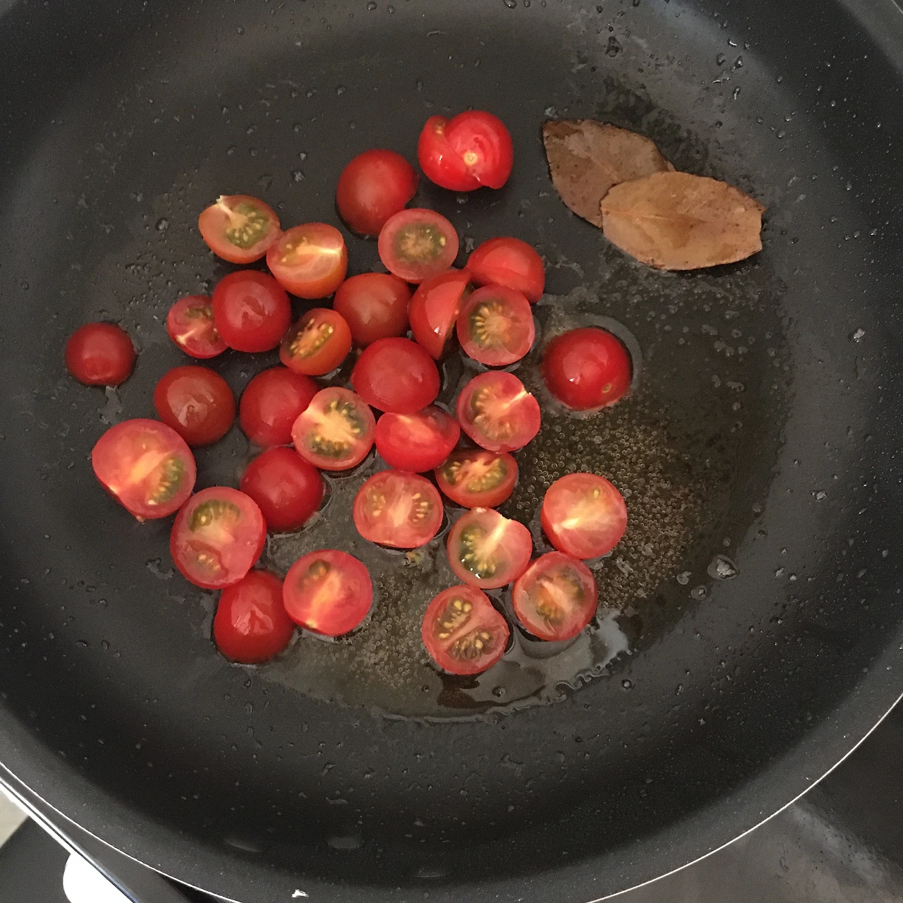 3 어린잎을 씻어 볼에 담고 연어를 구웠던 올리브 오일에 방울토마토를 반으로 잘라 빠르게 구워준 후 볼에 올려 그라나 파다노 치즈를 흩뿌려 곁들여 먹을 샐러드를 완성한다.